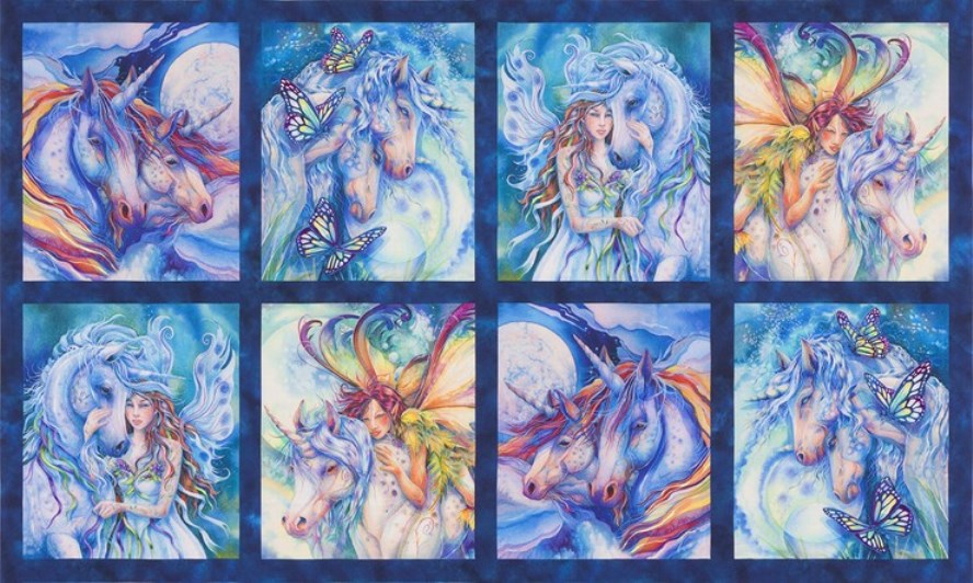 Grosses Patchworkpanel mit magischen Einhörnern und Elfen aus der Serie "Magic Unicorn". Ein romantisches Panel für zauberhafte Kissen, Taschen, Wandbilder, Patchwork und Dekorationen.