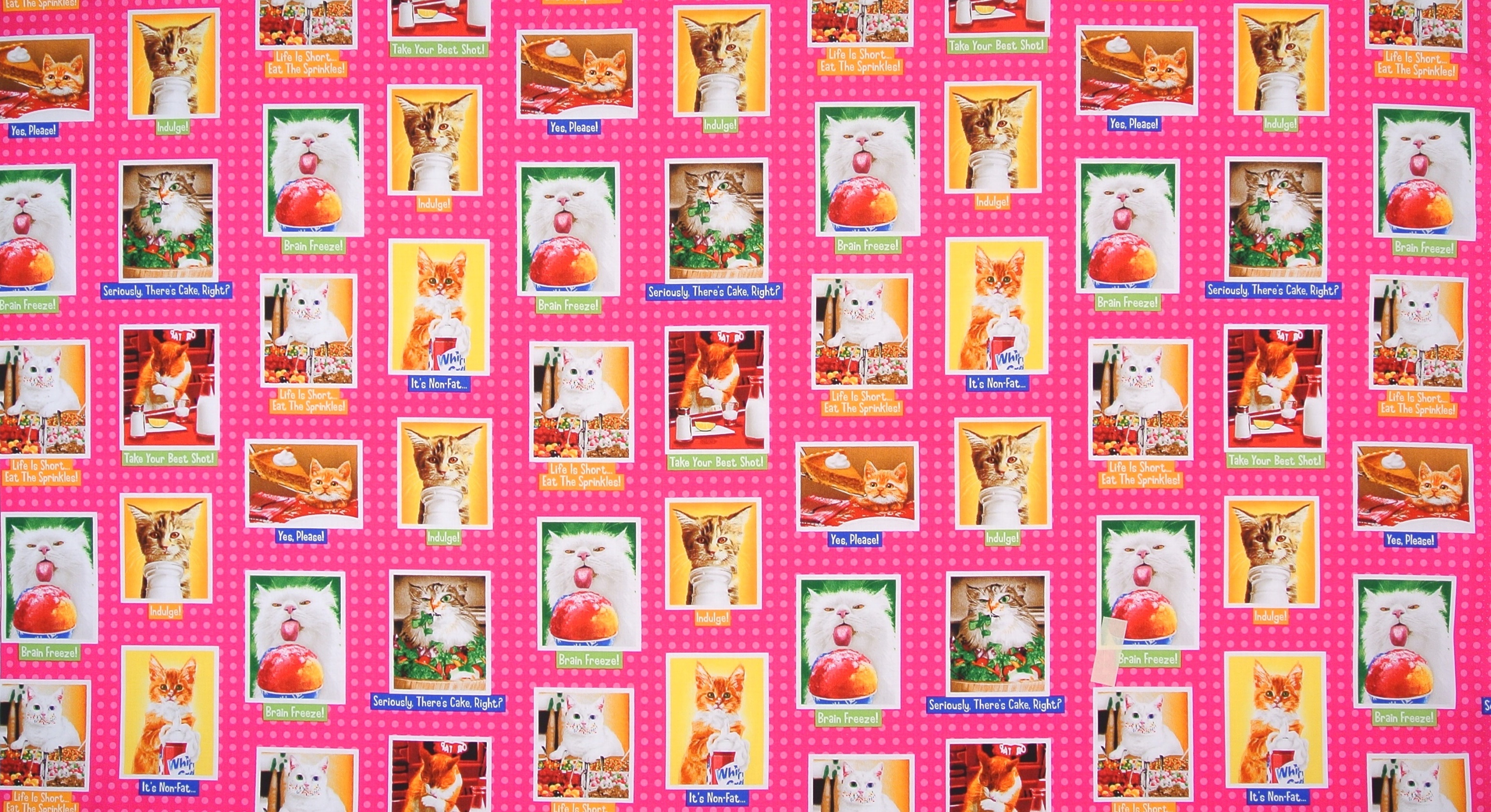 Patchworkstoff mit herrlich witzigen Katzen und Fast Food auf Pink aus der Serie "Eat, Drink and be Funny".
