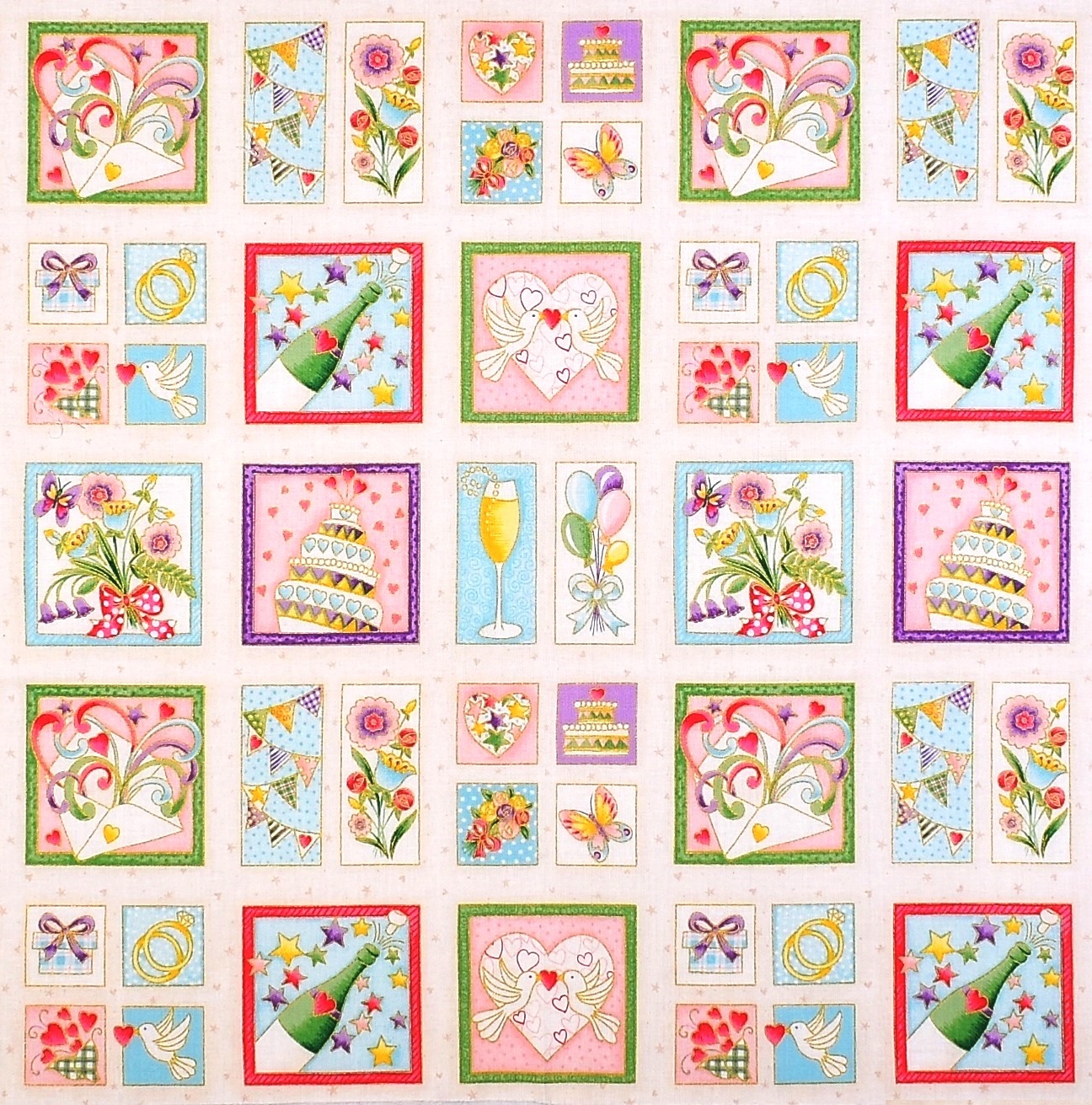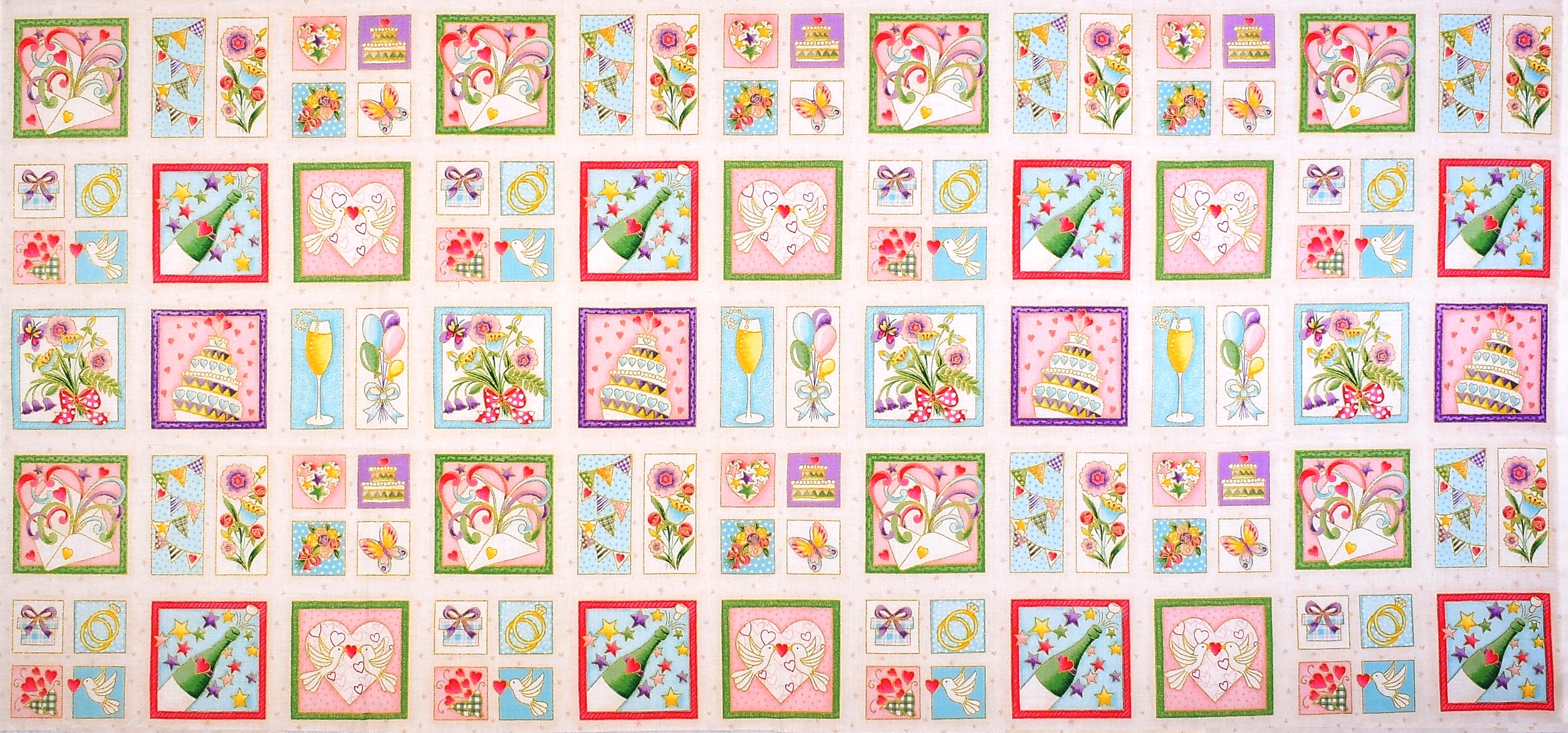 SALE Romantischer Patchworkstoff mit kleinen Bildern rund um die Hochzeitsfeier aus der Serie "Celebration" von Makower.