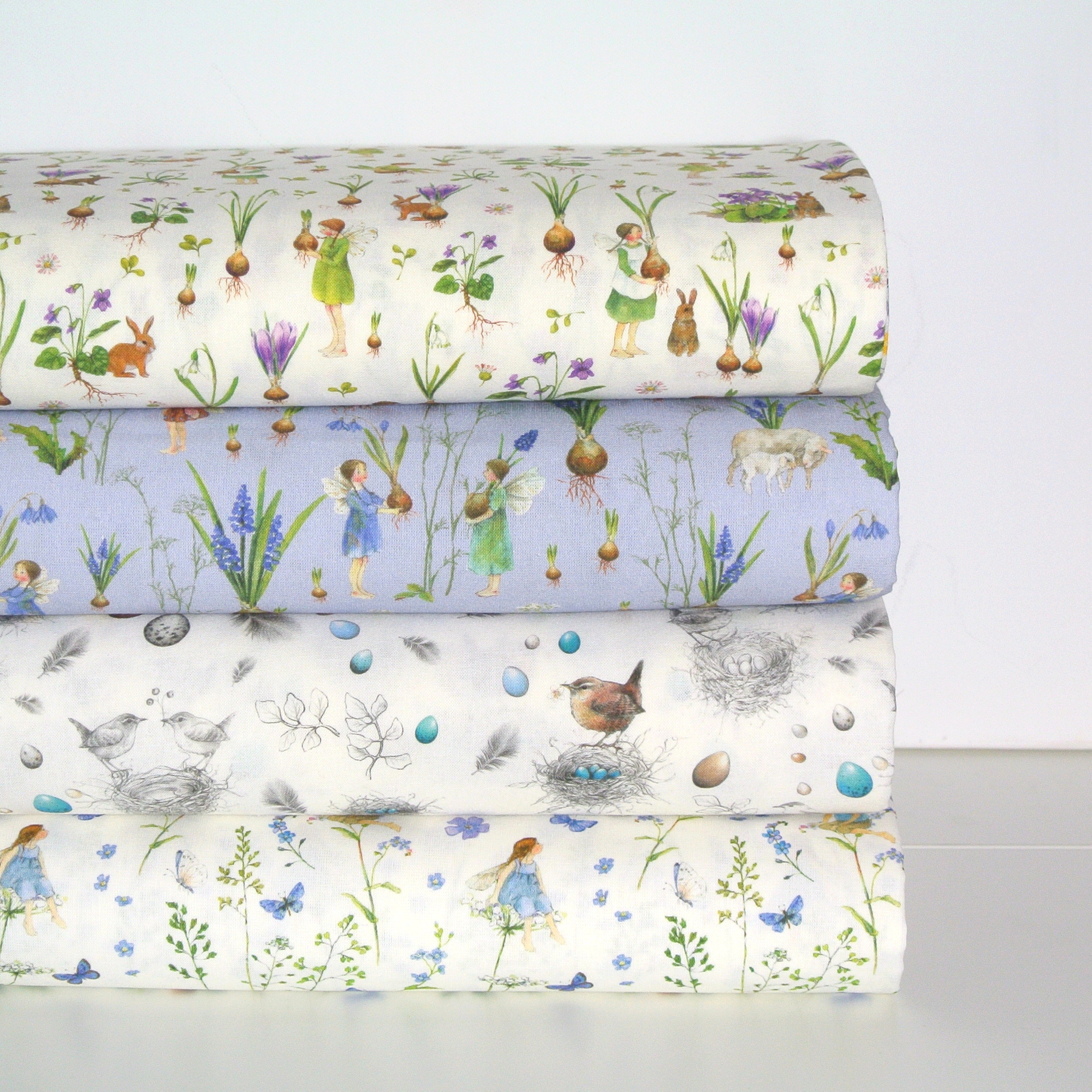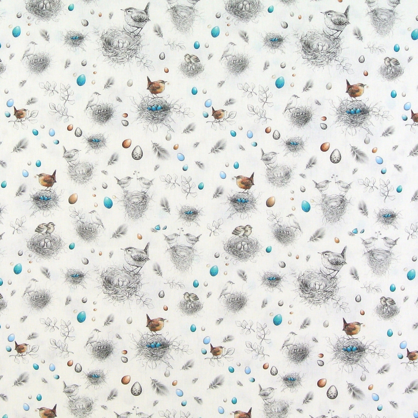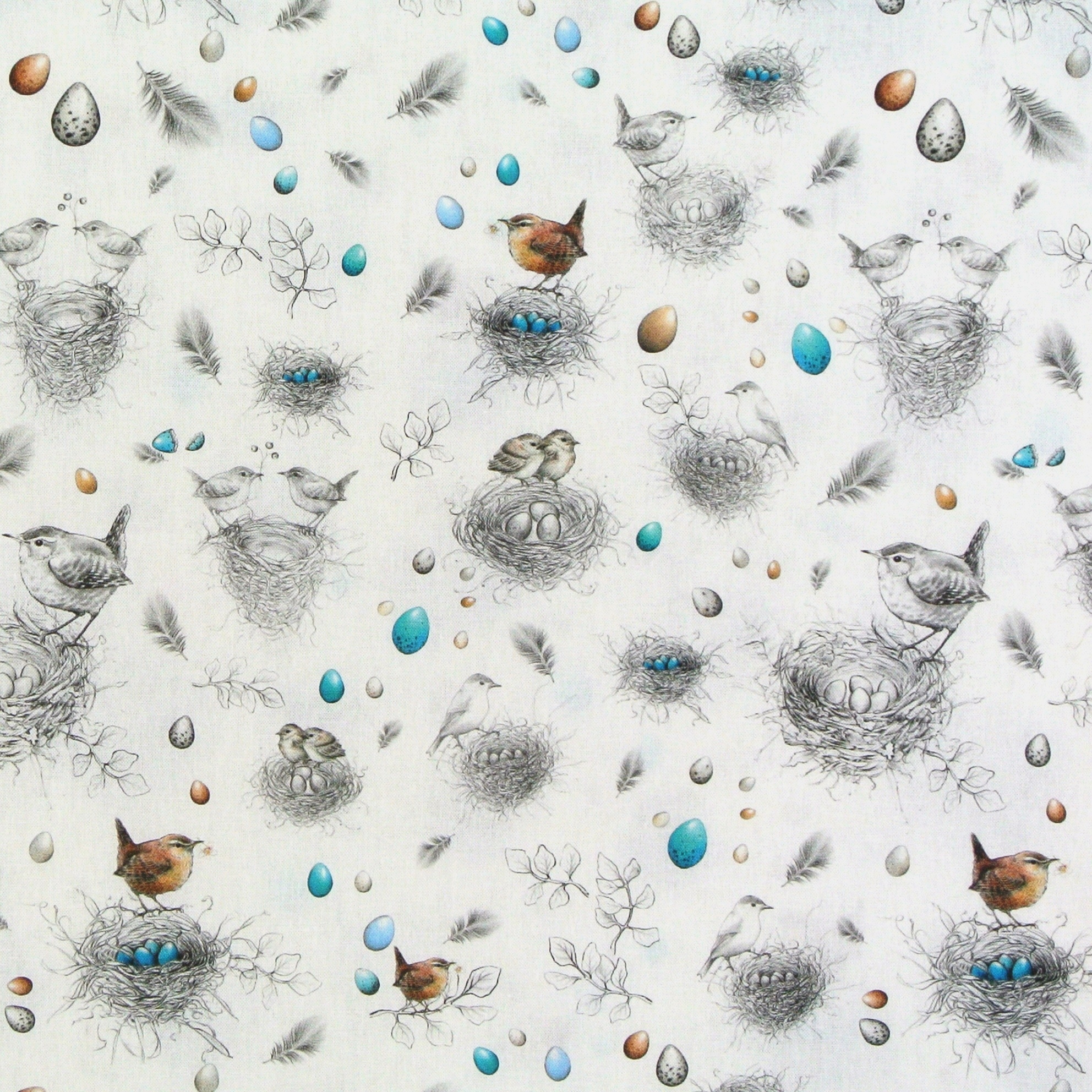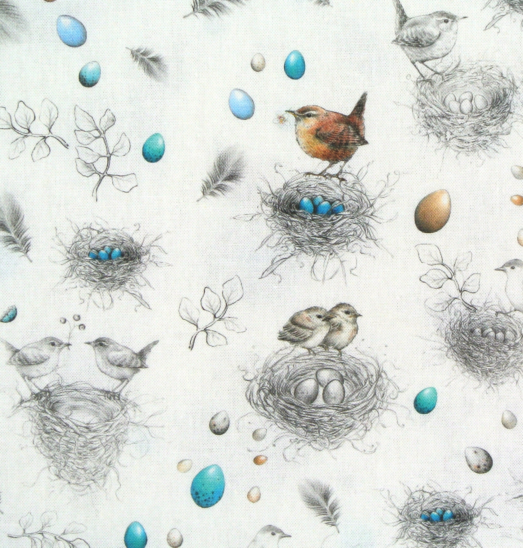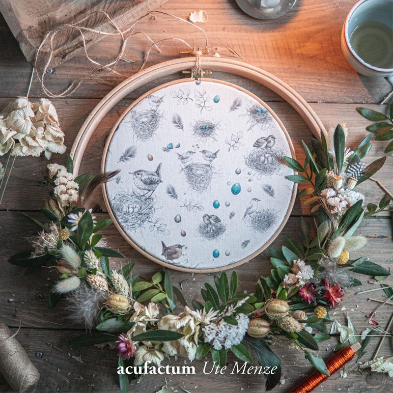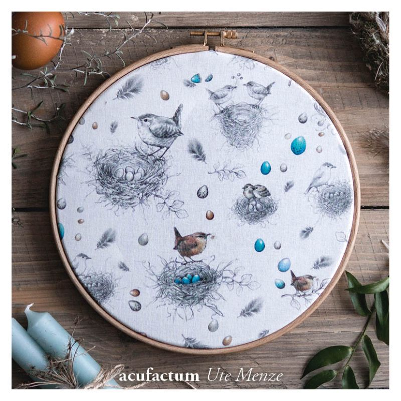 Baumwollstoff "Vogelnester" aus dem Hause acufactum mit zauberhaften, zart gezeichneten Vogelnestern, Vögeln und farbigen Eiern auf naturfarbenem Grund. Liebevoll gestaltet von der Designerin Sophia Drescher.