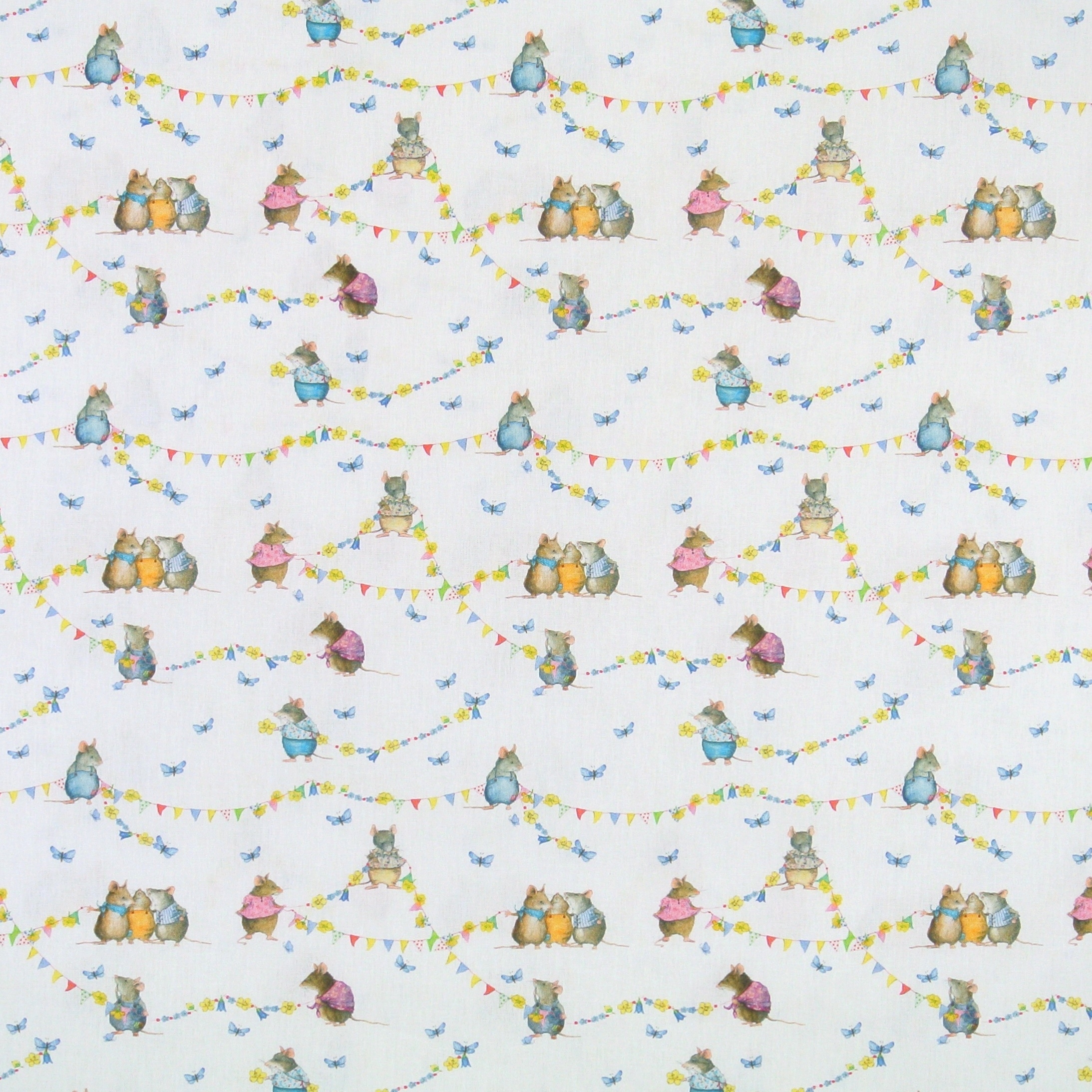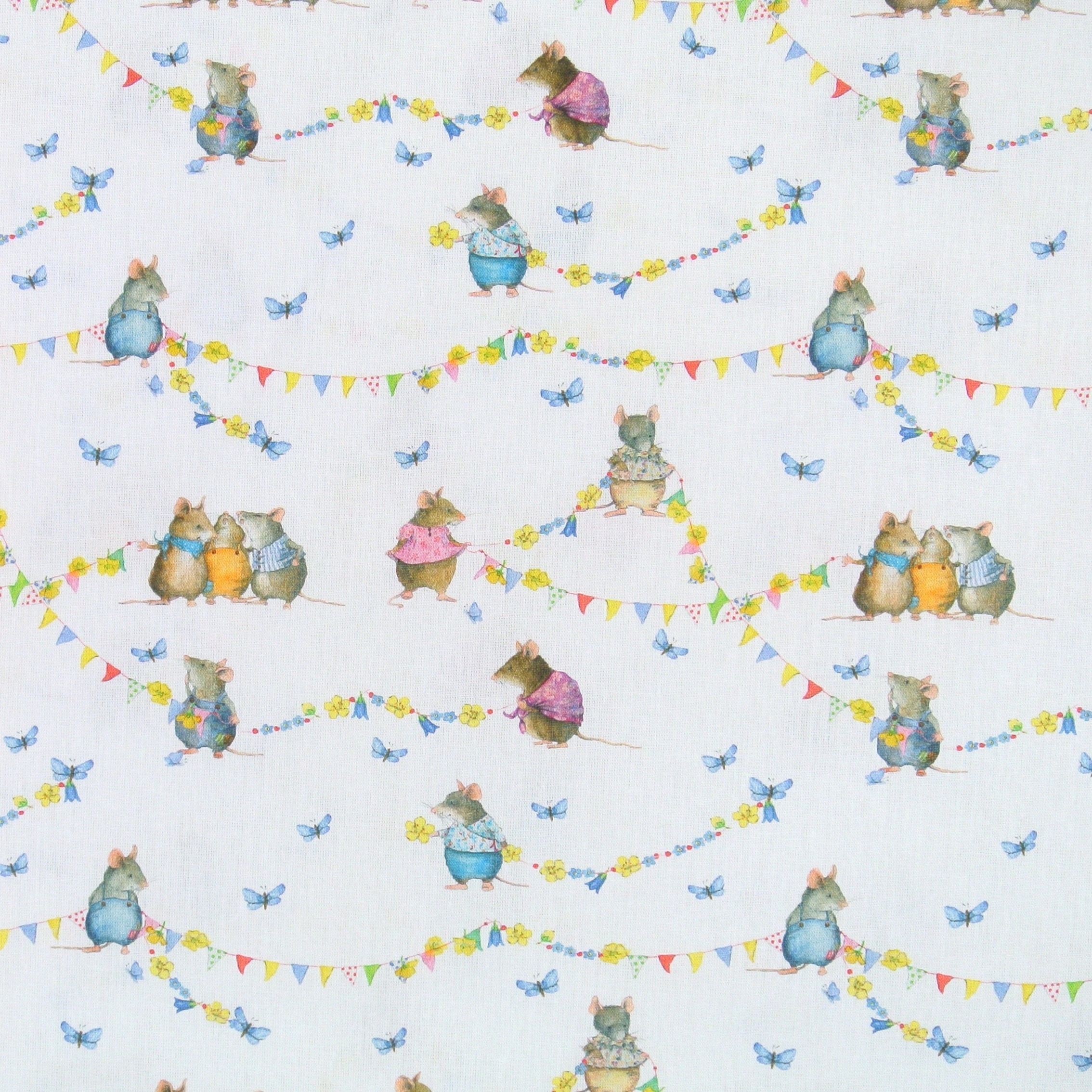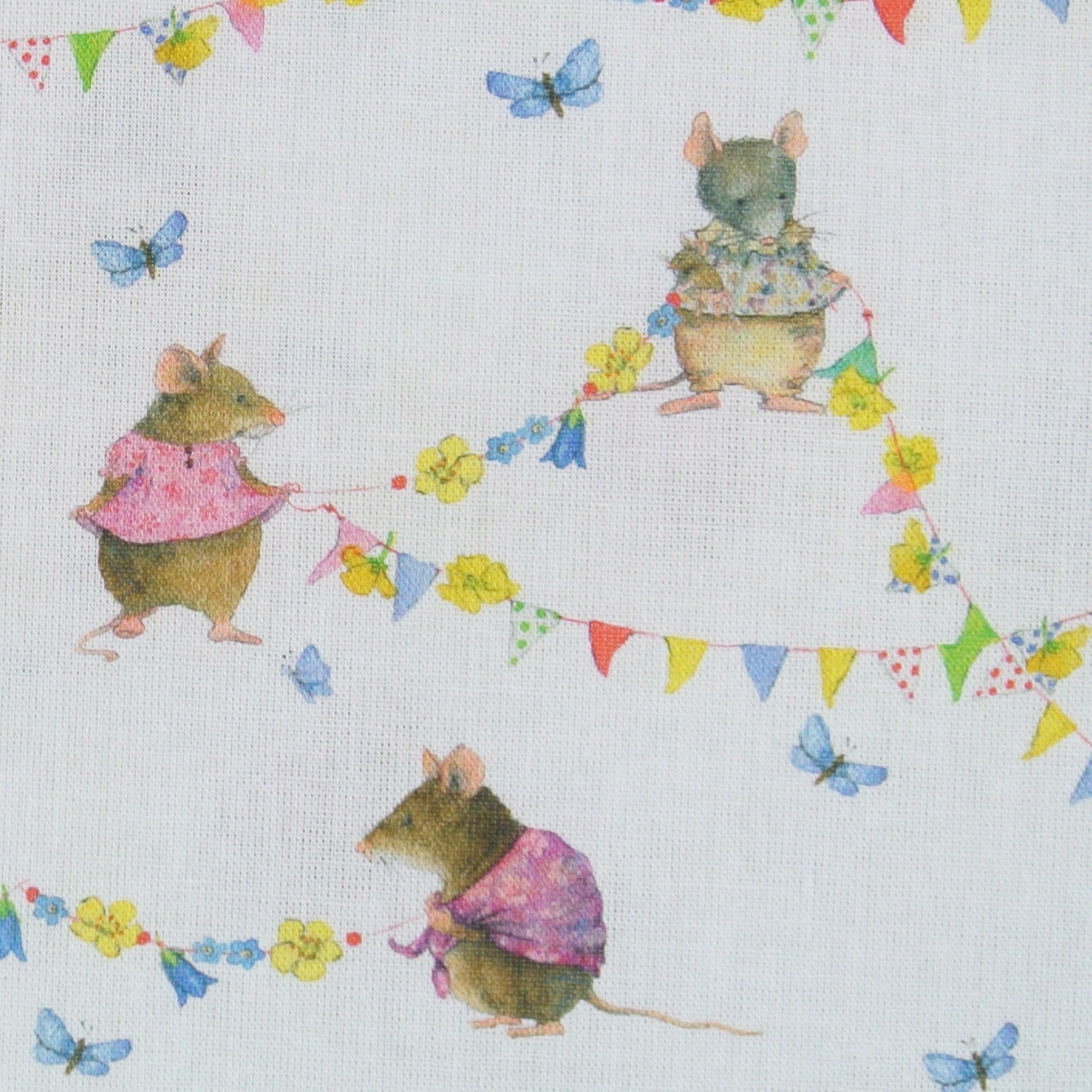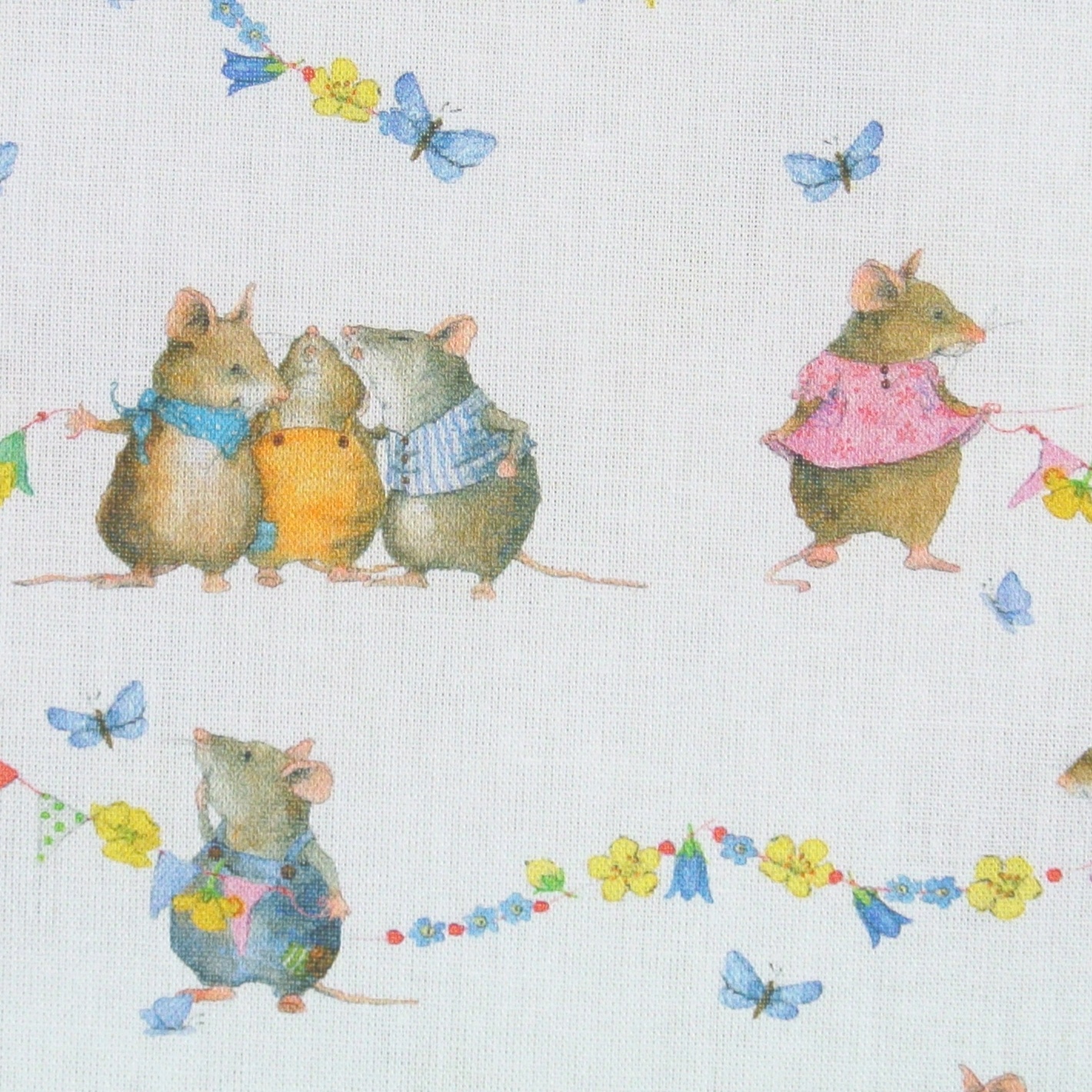Einzigartiger Baumwollstoff "Mausesommer" aus dem Hause acufactum mit zauberhaften kleinen Mäusen und kunterbunten Girlanden aus der Feder der Designerin Daniela Drescher.