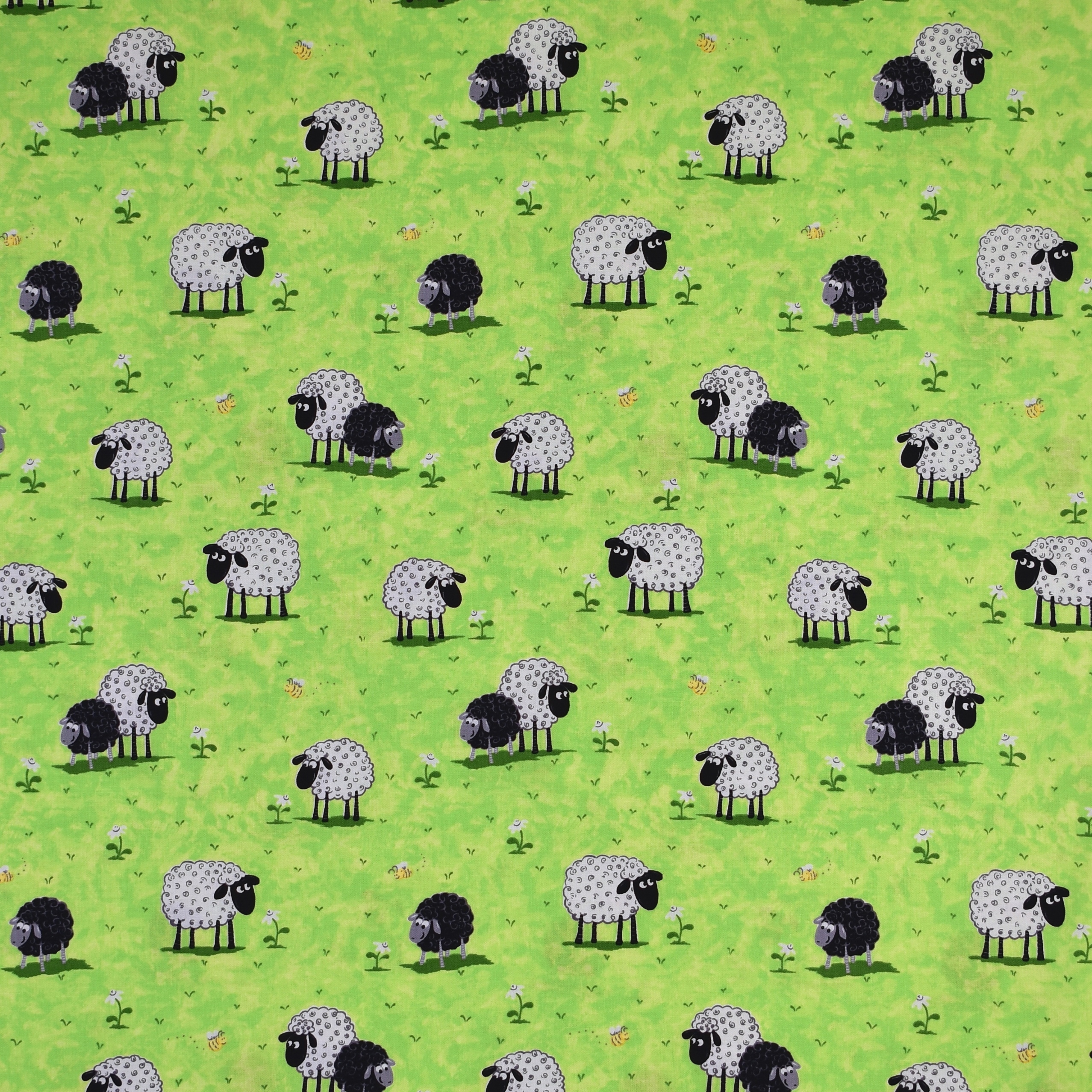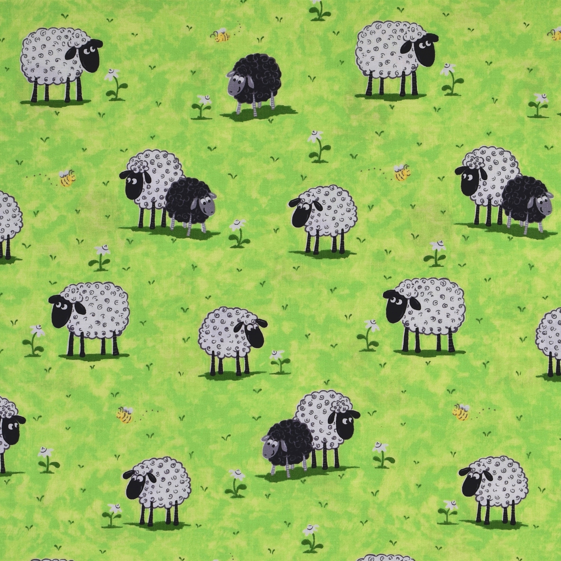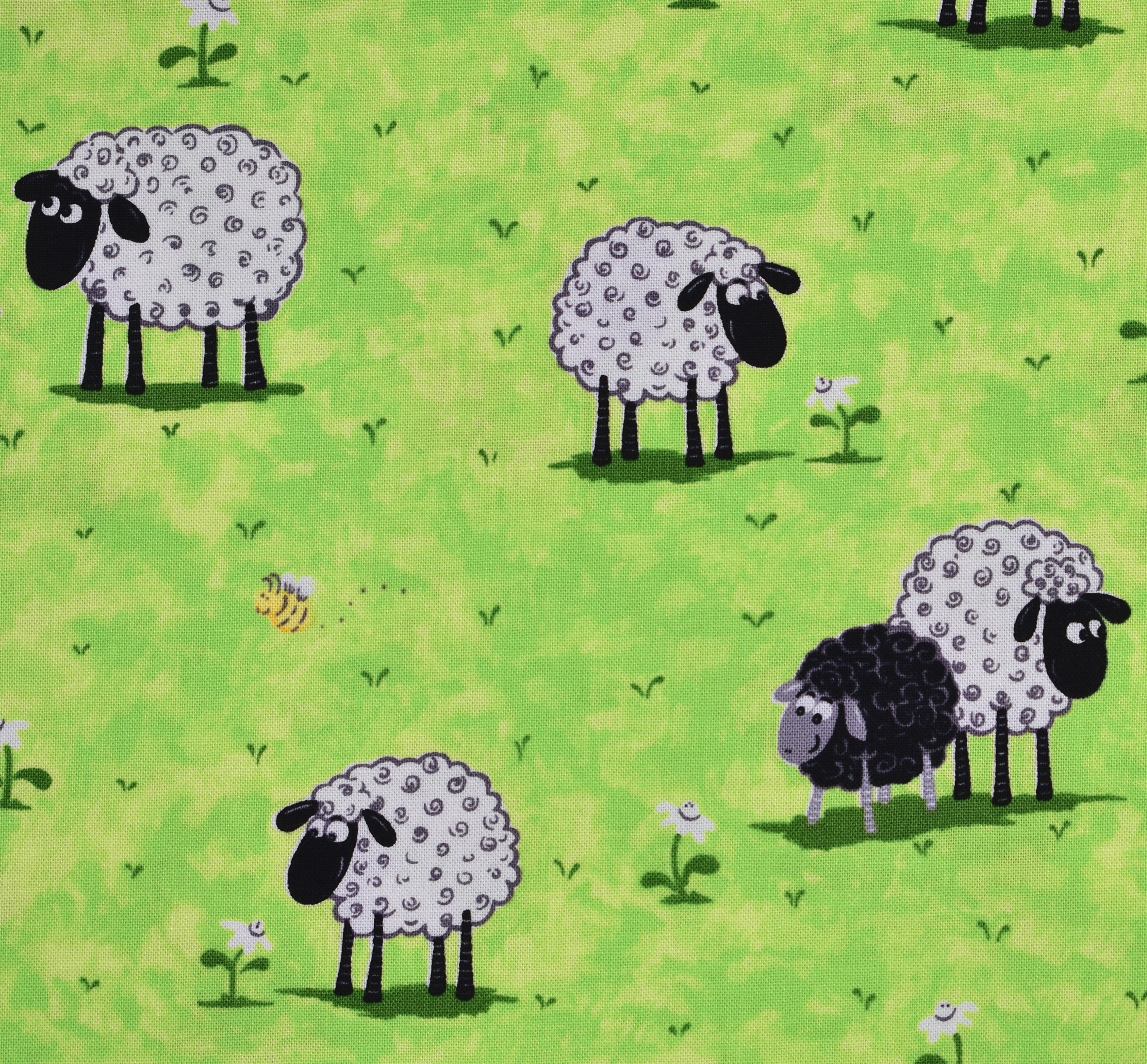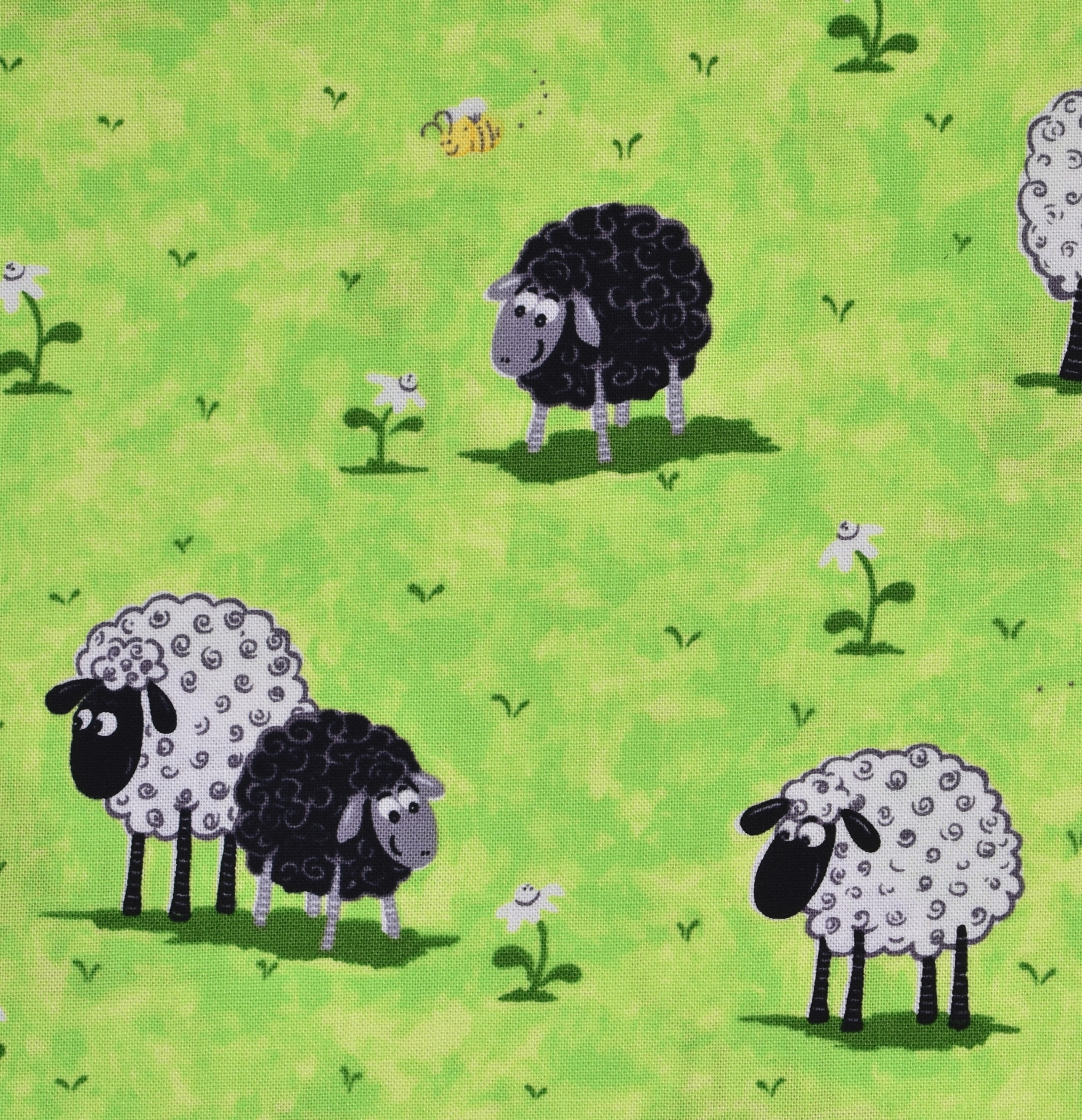 Patchworkstoff aus der Serie "Lewe" mit kleinen Schafen, Bienen und Blumen auf der Wiese. Nähen Sie aus diesem fröhlichen Kinderstoff Kissen, Taschen, Beutel, Decken, Kinderkleidung und Dekorationen fürs Kinderzimmer.