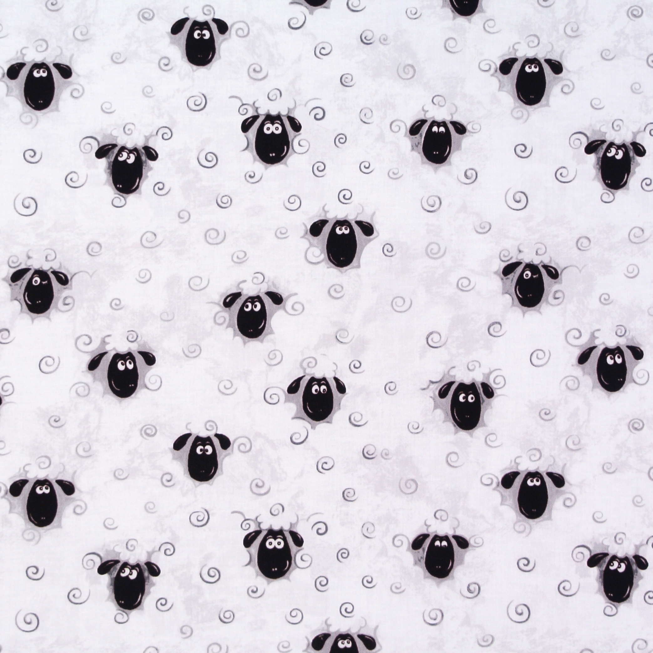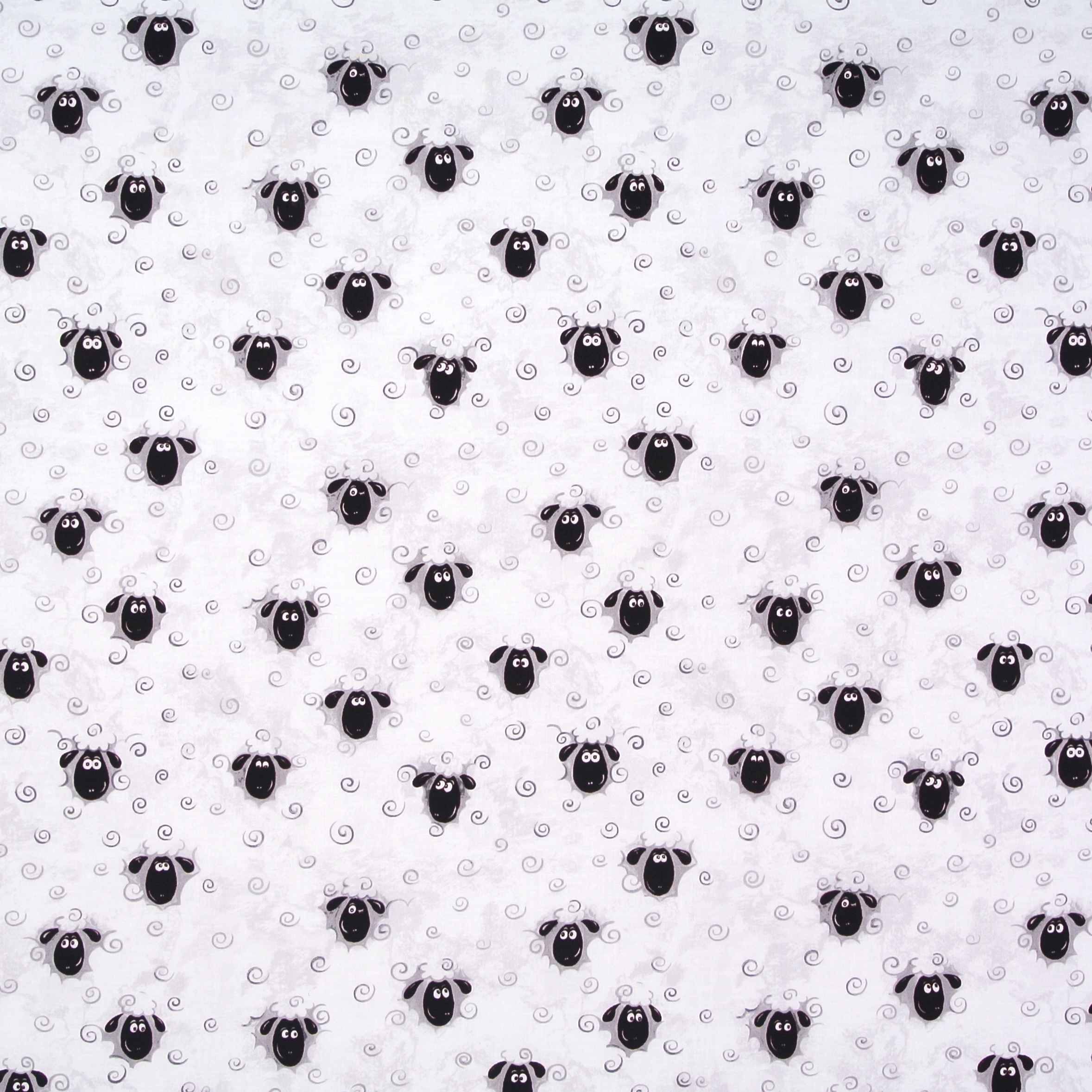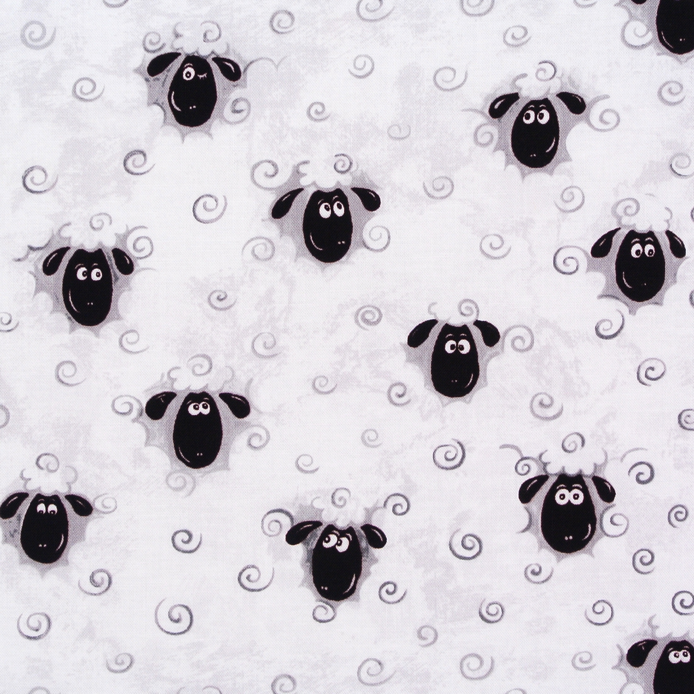 Patchworkstoff aus der Serie "Lewe" mit wolligen kleinen schwarz-weißen Schafen. Nähen Sie aus diesem fröhlichen Kinderstoff Kissen, Taschen, Beutel, Decken, Kinderkleidung und Dekorationen fürs Kinderzimmer.
