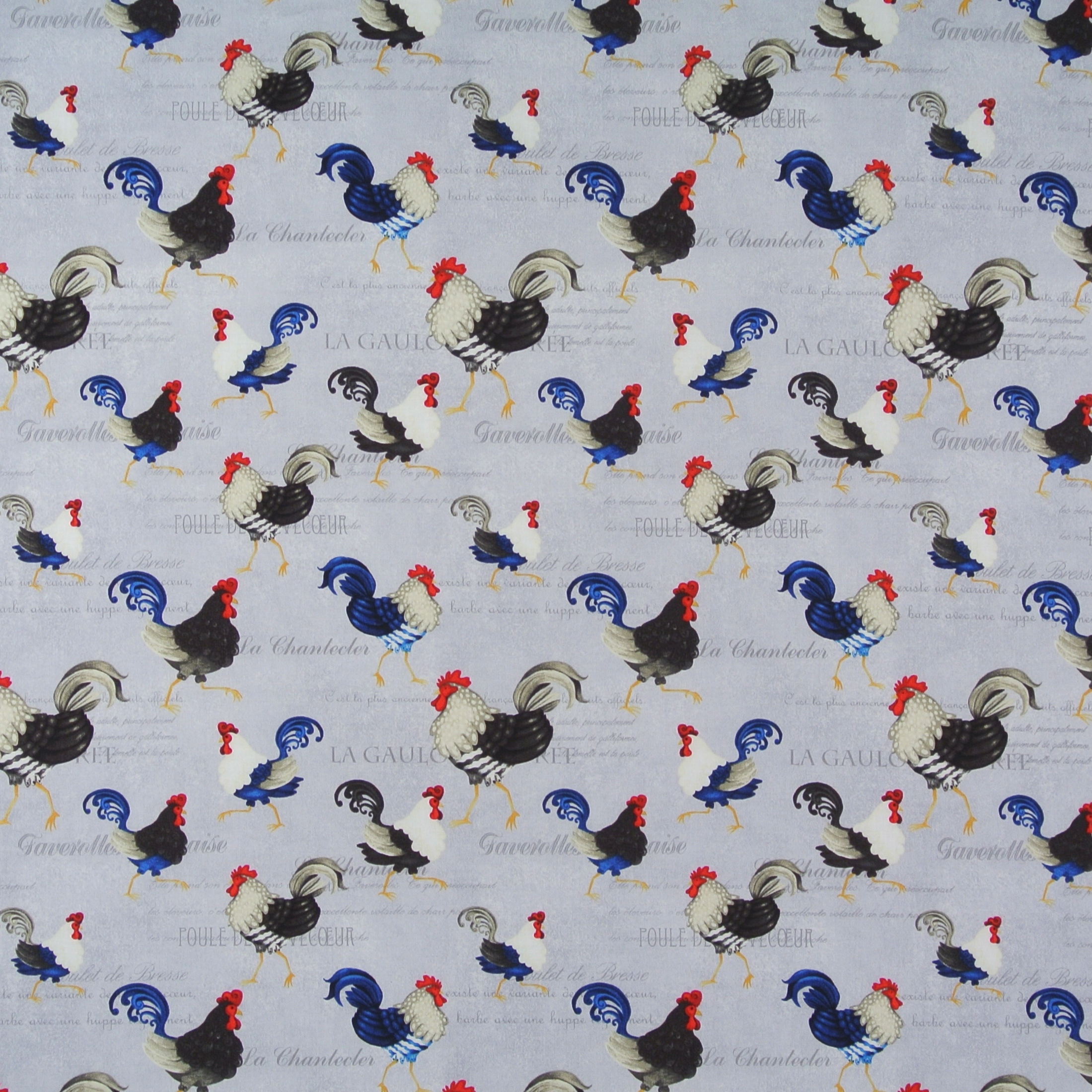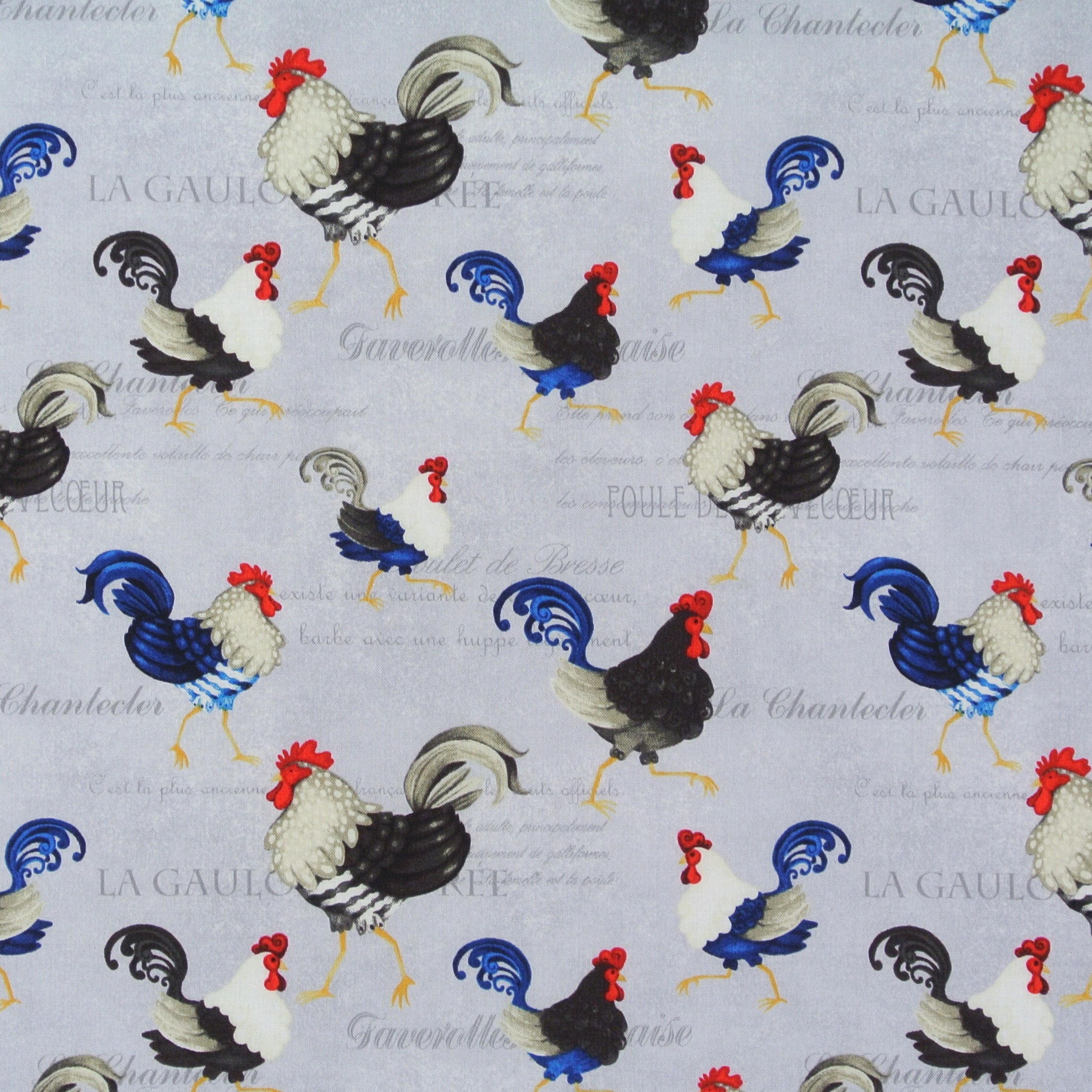 SALE Patchworkstoff mit stolzen Hähnen und Schrift auf Hellgrau aus der Serie "Morning Call". Ein ausgefallener Stoff für Schürzen, Tischwäsche, Kissen, Wandbilder, Patchwork und Dekorationen.