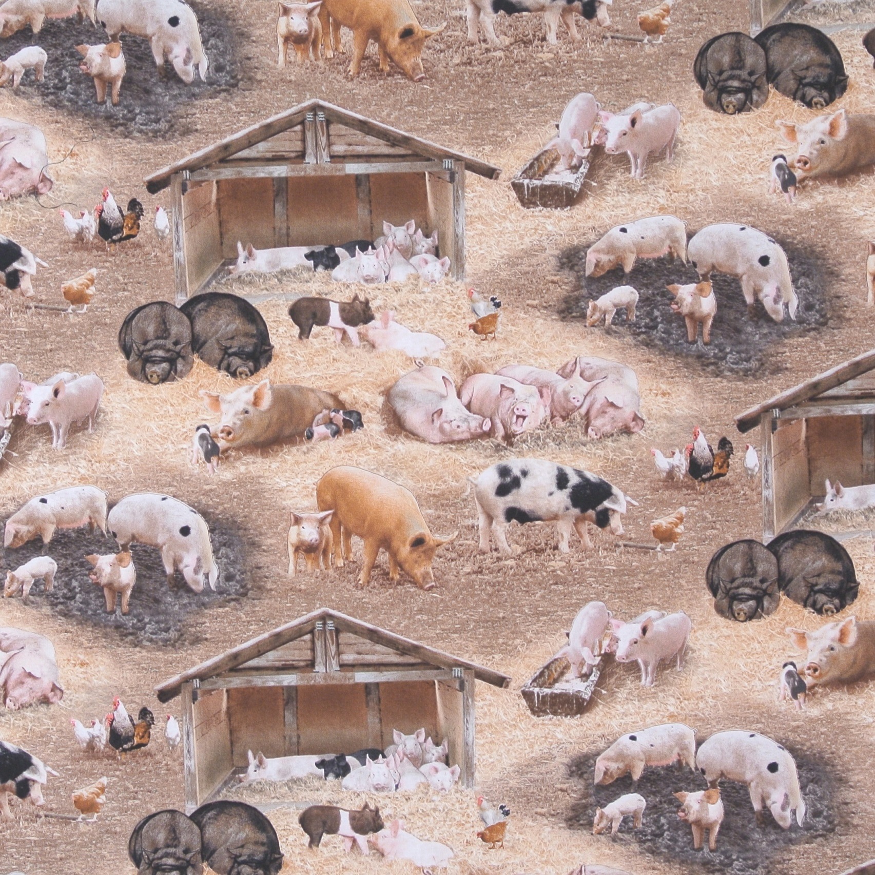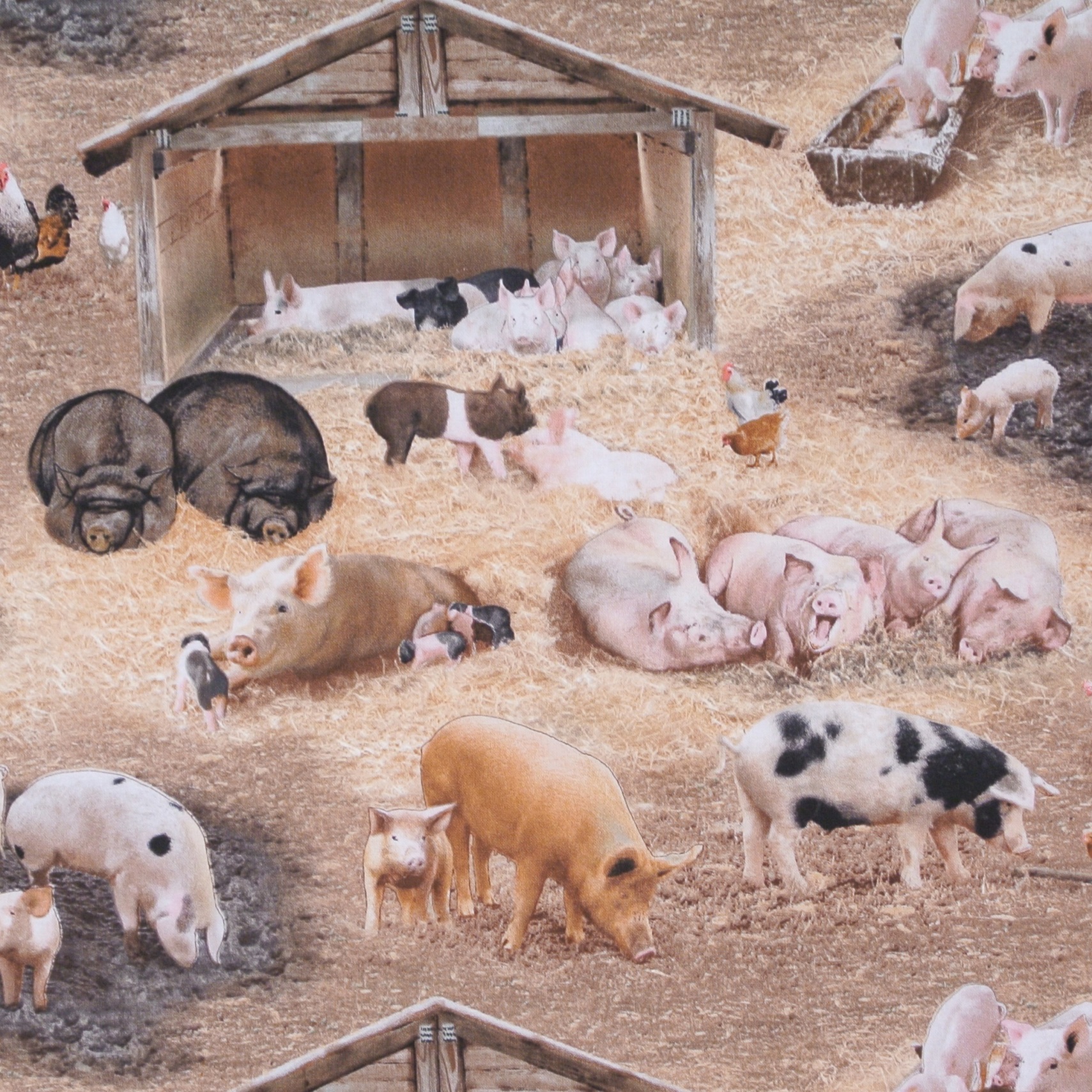 Patchworkstoff mit glücklichen grossen und kleinen Schweinen aus der Serie "Farm Animals".