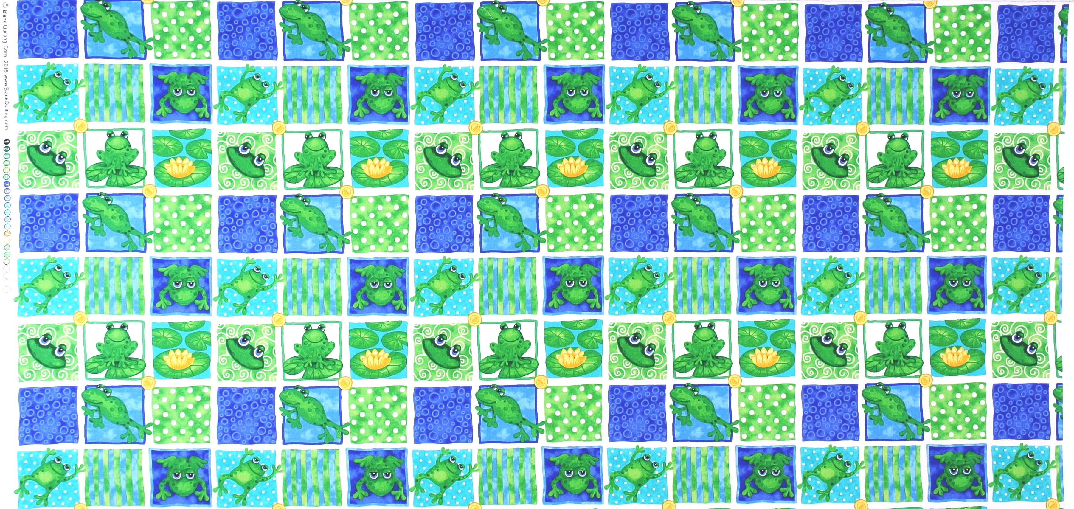 Patchworkstoff mit witzigen Froschbildern aus der Serie "Froggin`Around".