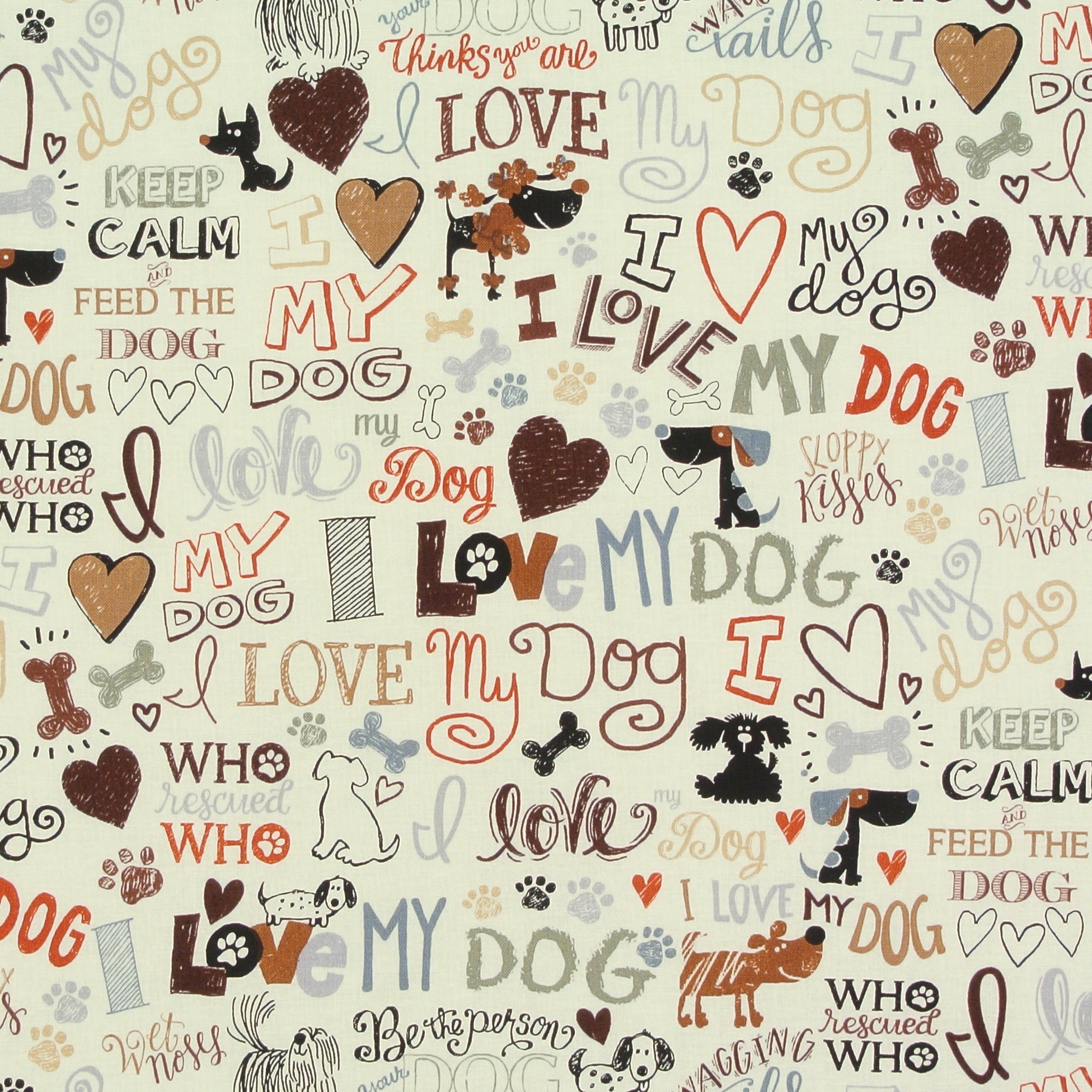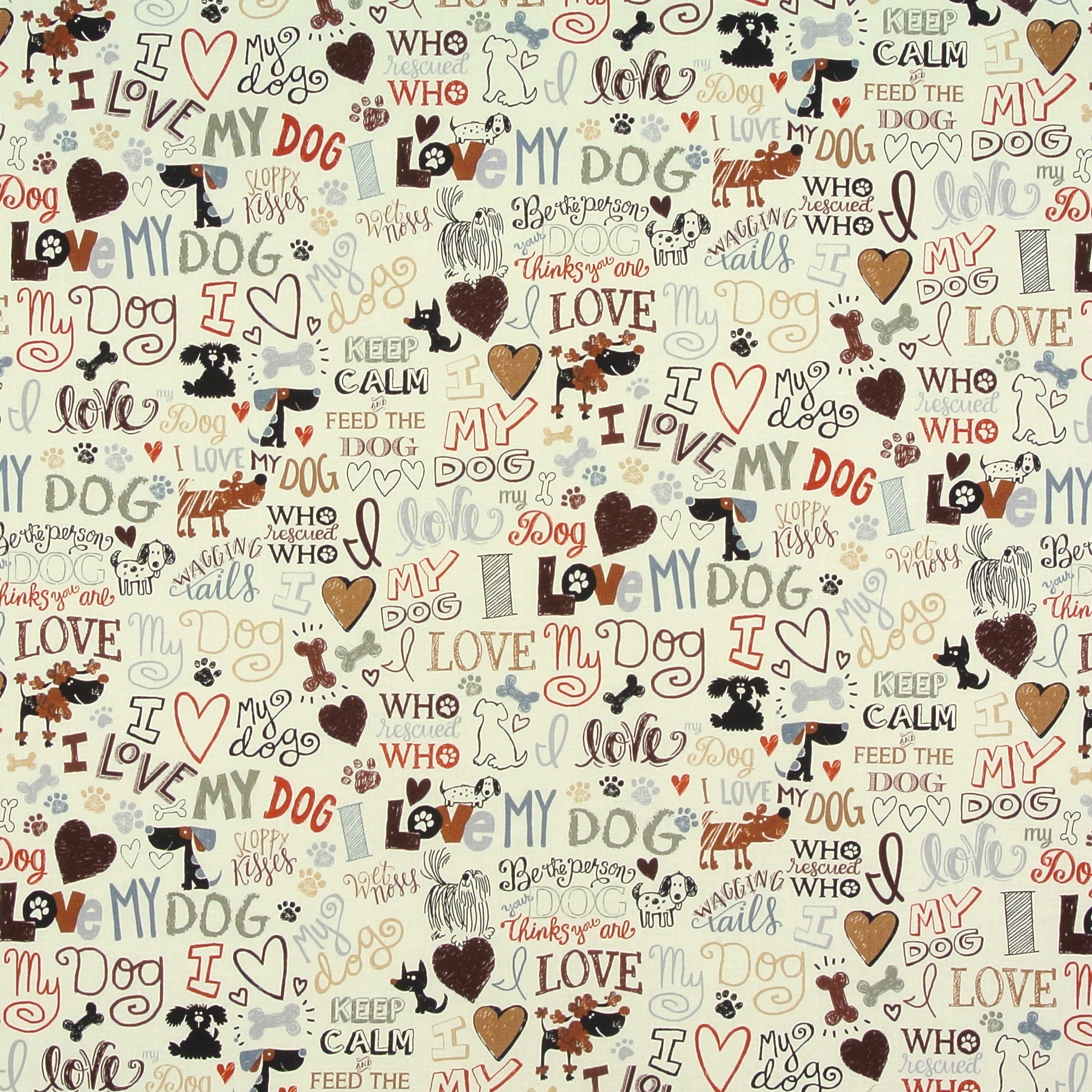 Patchworkstoff "I love my Dog" mit vielen Hunden, Herzen und Schriftzügen auf Hellbeige aus der Serie "Cats and Dogs" von Timeless Treasures..