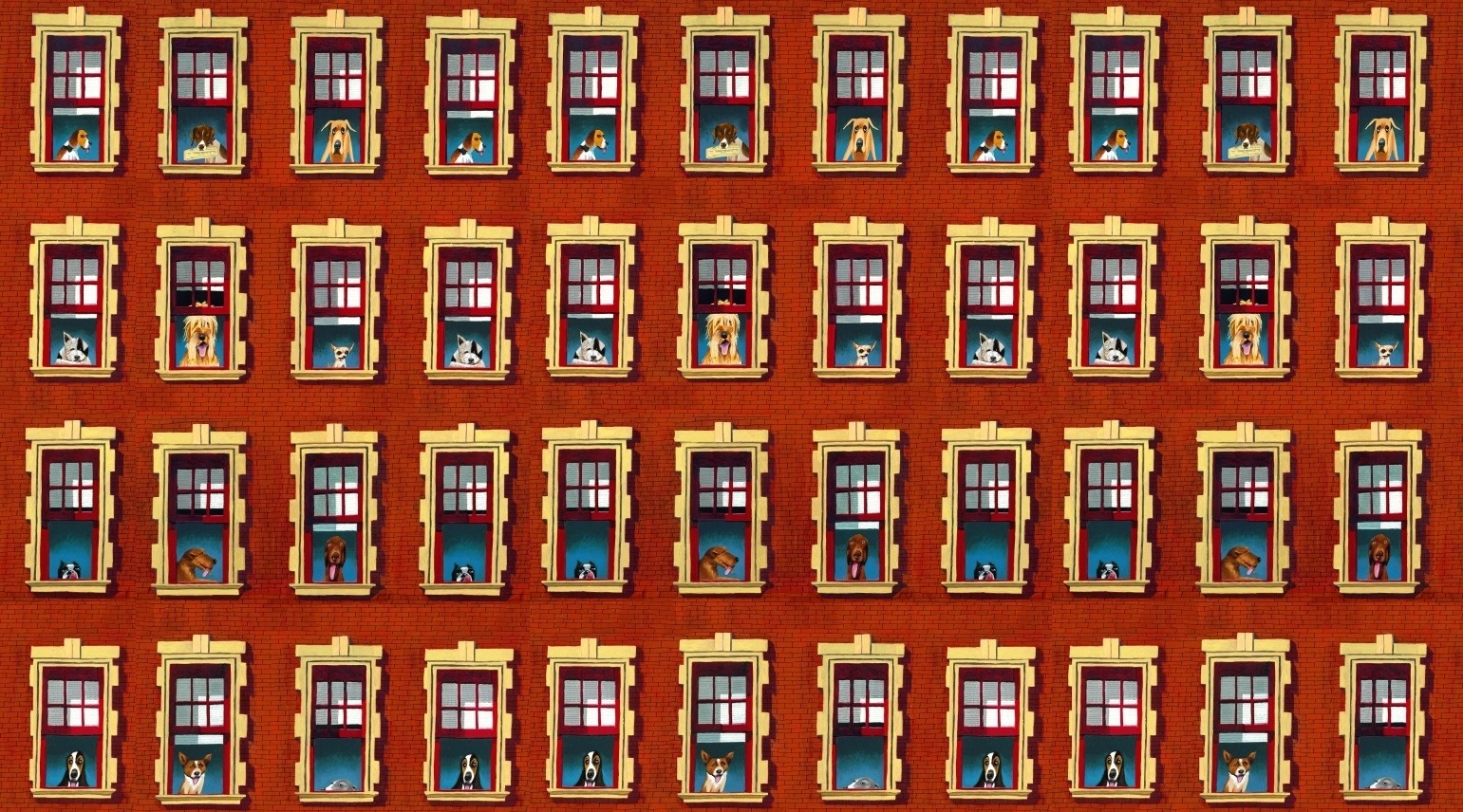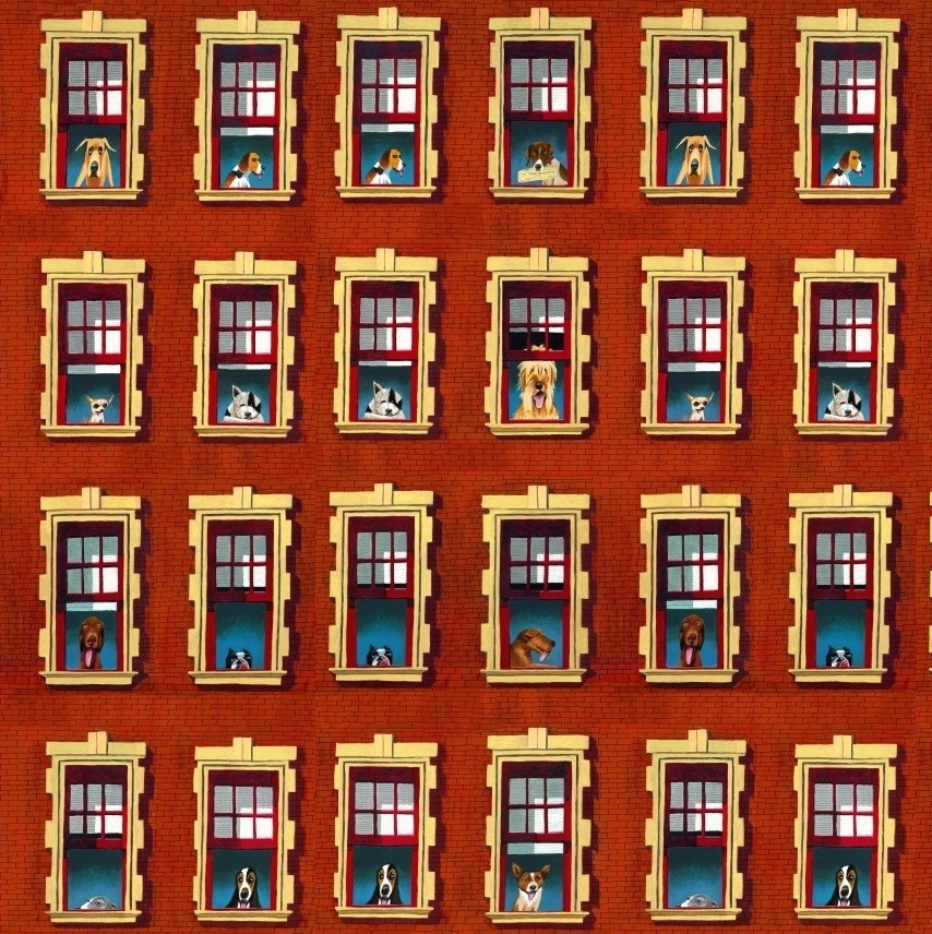 SALE Patchworkstoff mit vielen witzigen Hunden am Fenster aus der Serie "Dogs Rule".