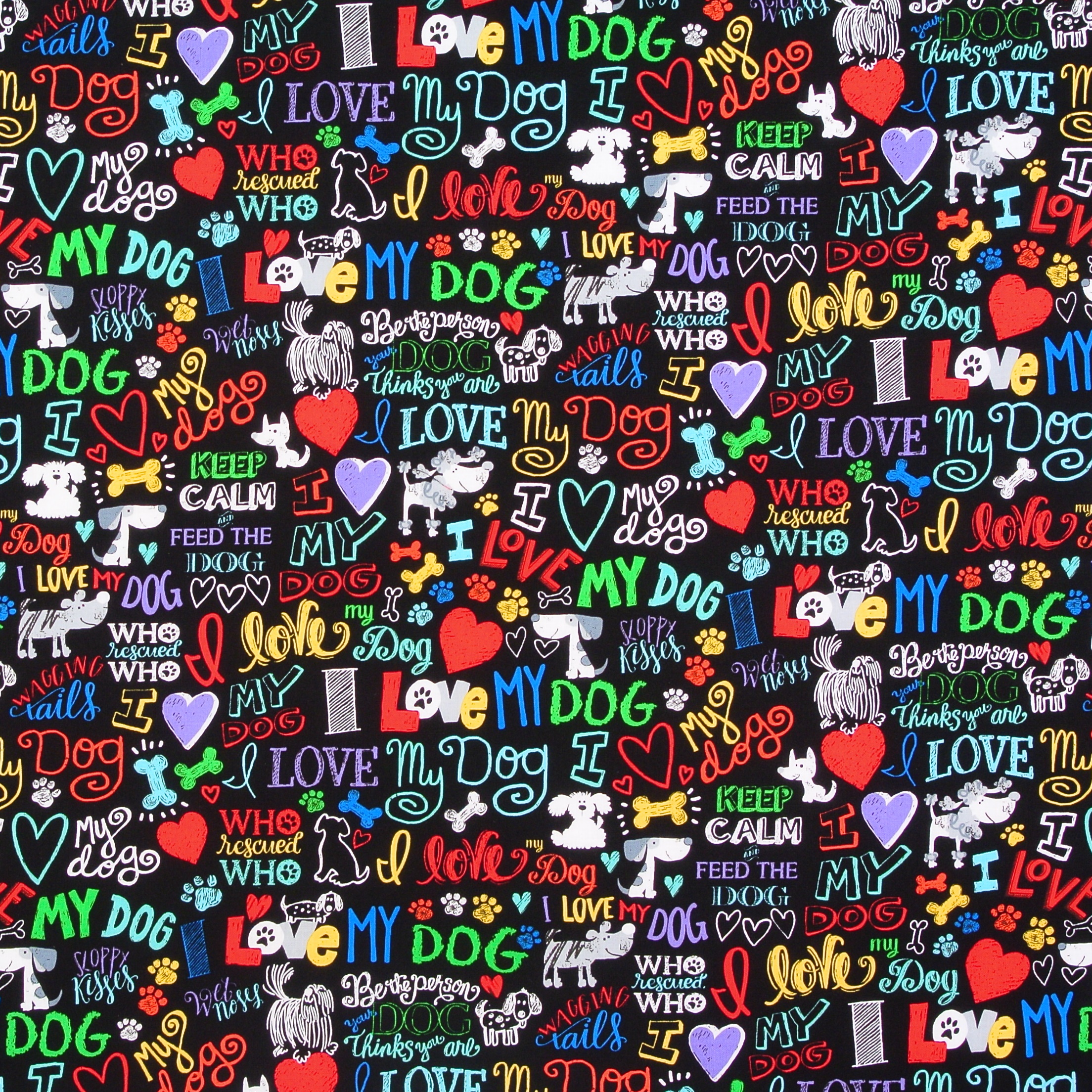 I love my Dog ... Patchworkstoff mit vielen Hunden, Herzen und Schriftzügen aus der Serie... mehr