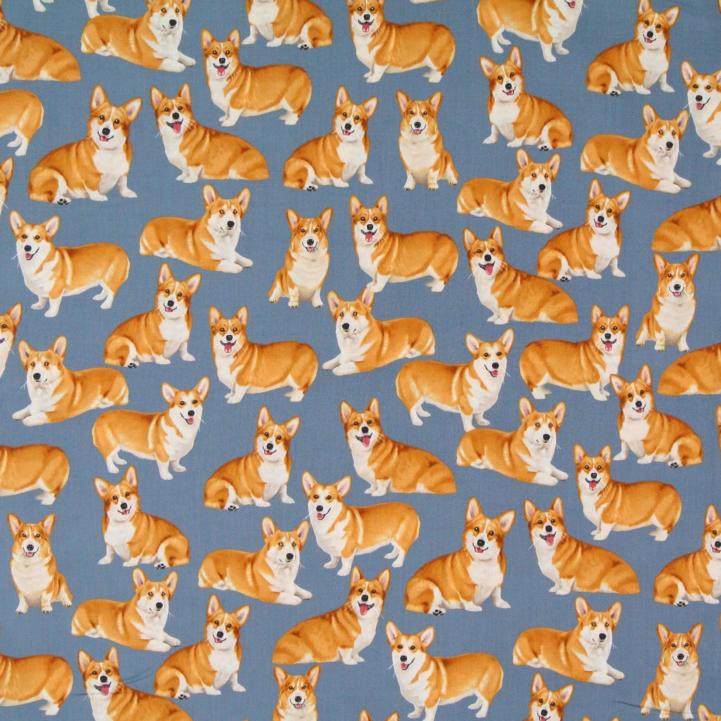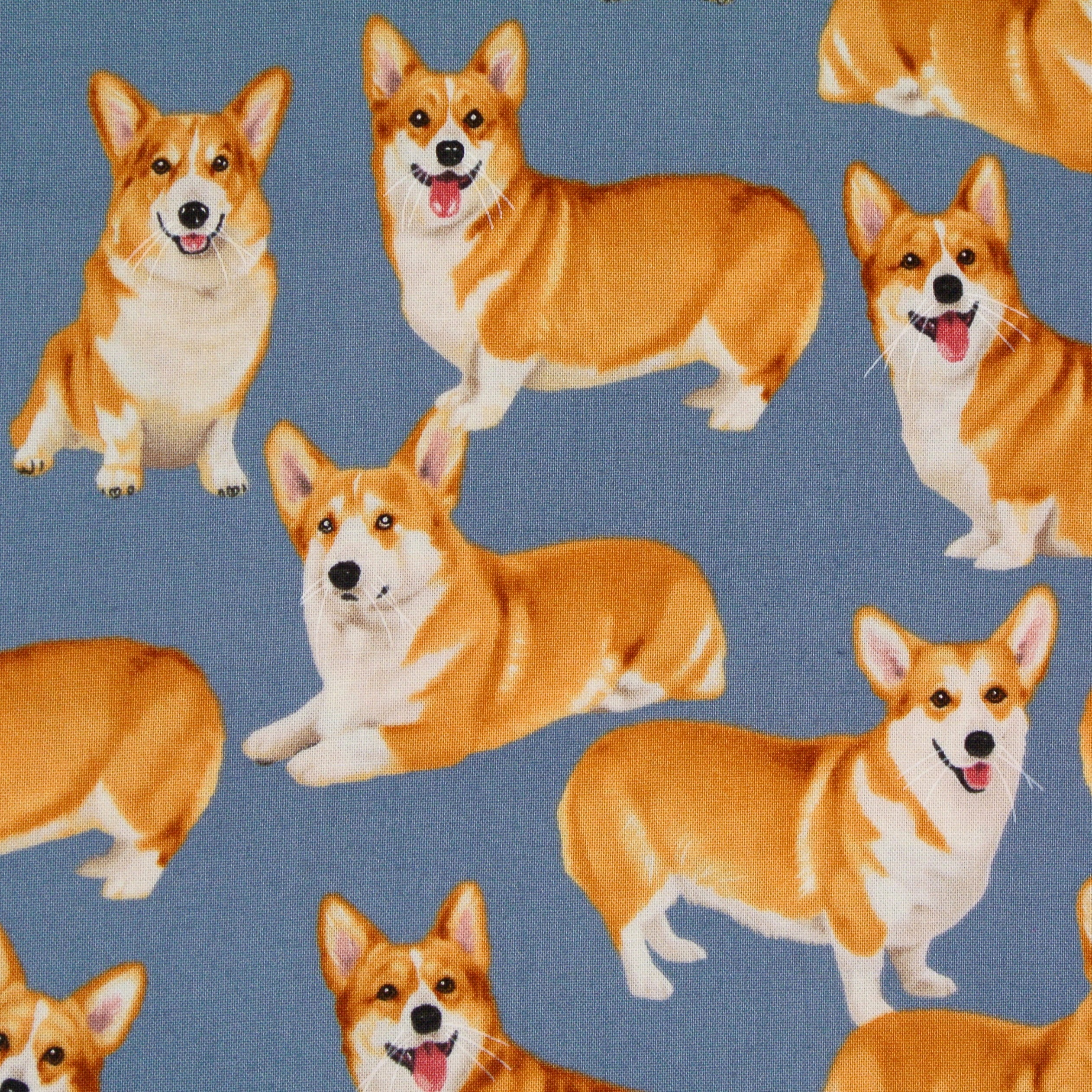 Patchworkstoff mit vielen Corgis auf Grau-Blau aus der Serie "Cats and Dogs". Ein schöner Stoff für Hundeaccessoires, Taschen, Kissen, Patchwork und Dekorationen.
