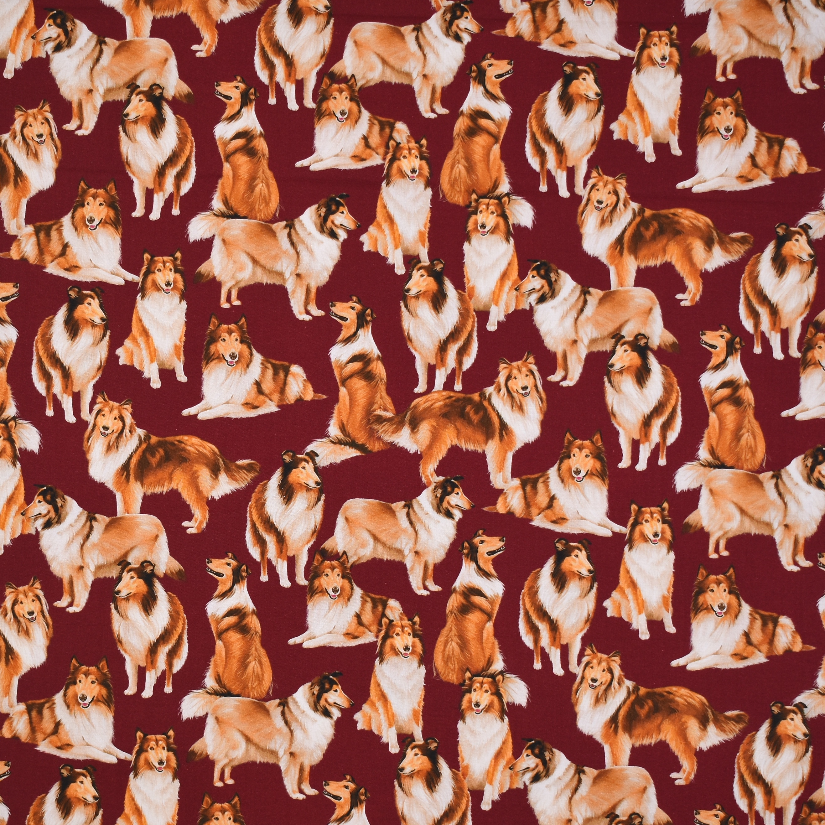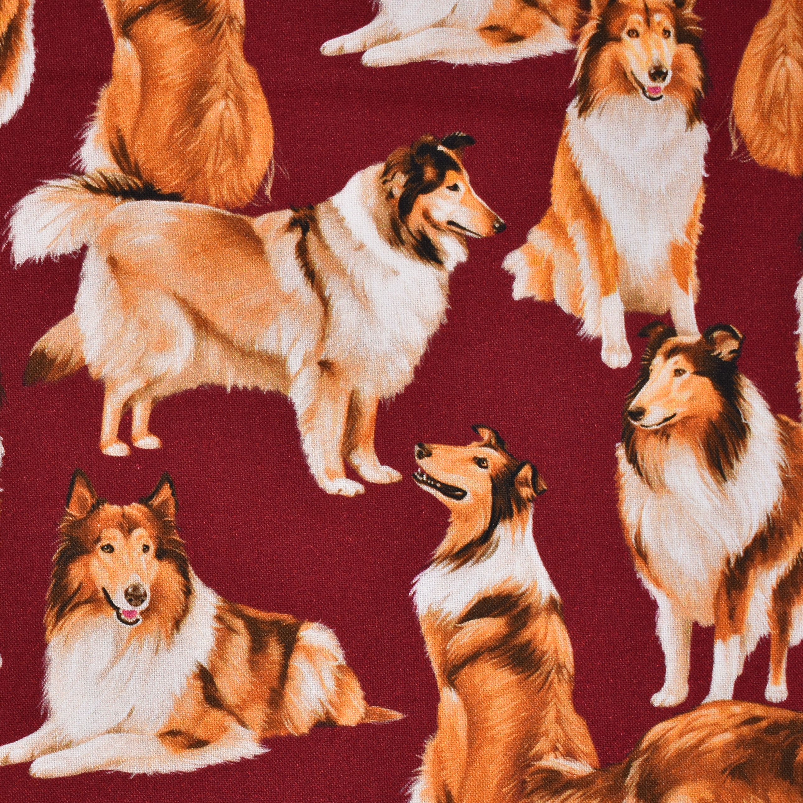 Patchworkstoff für Hundeliebhaberinnen mit Collies auf Weinrot aus der Serie "Pure Breeds" von Timeless Treasures.
