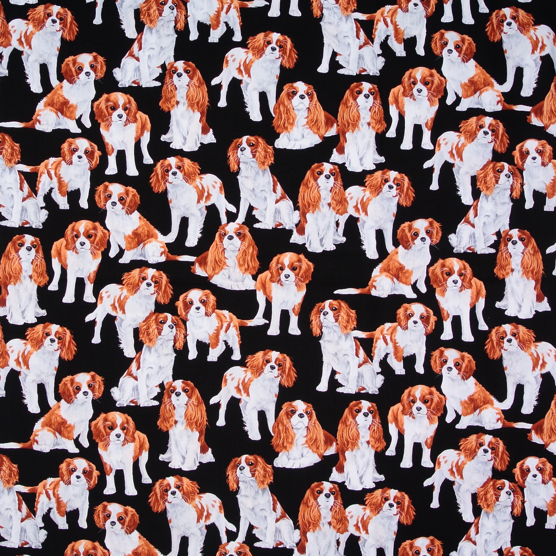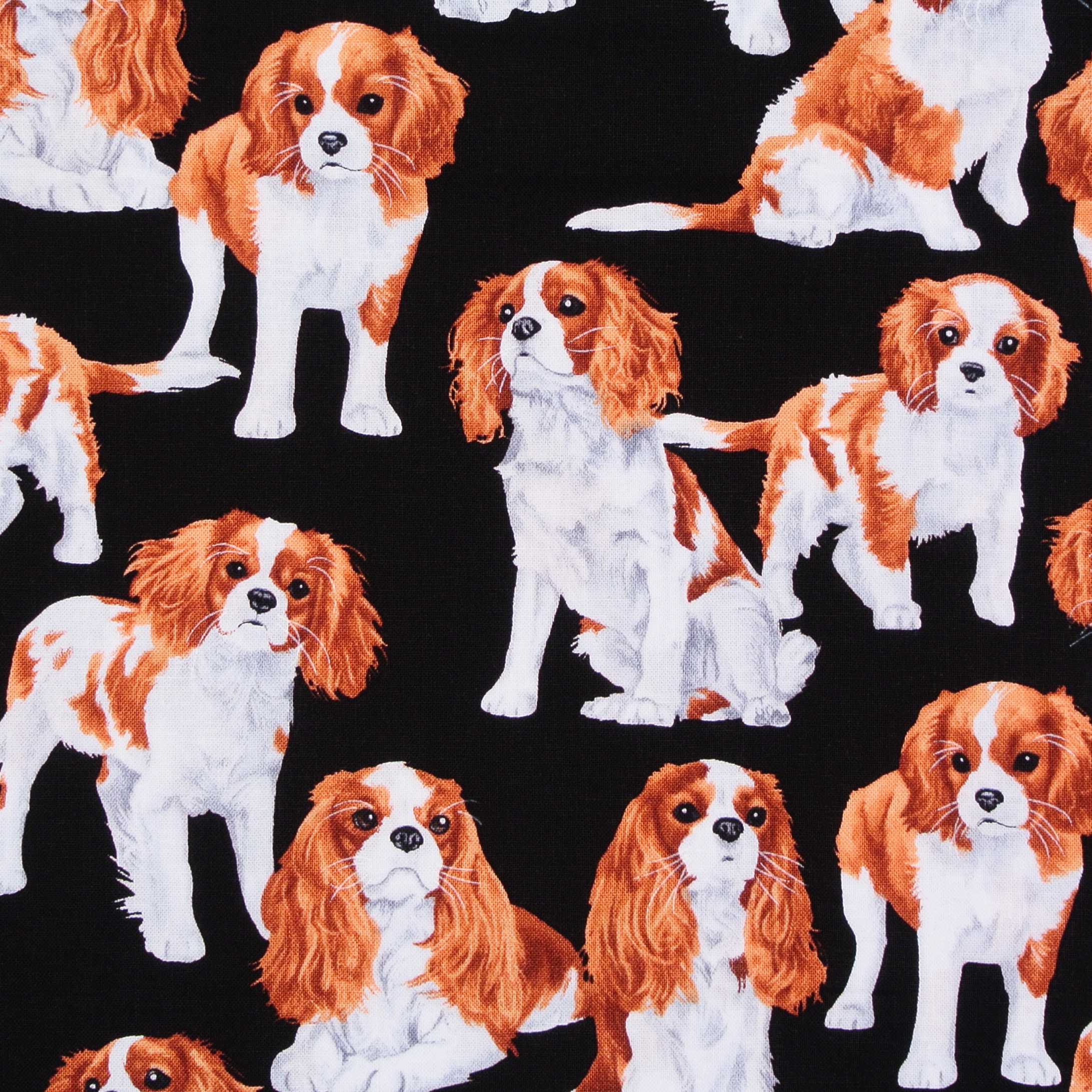 Ausgefallener Patchworkstoff mit edlen Hunden der britischen Rasse Cavalier King Charles Spaniel auf Schwarz.