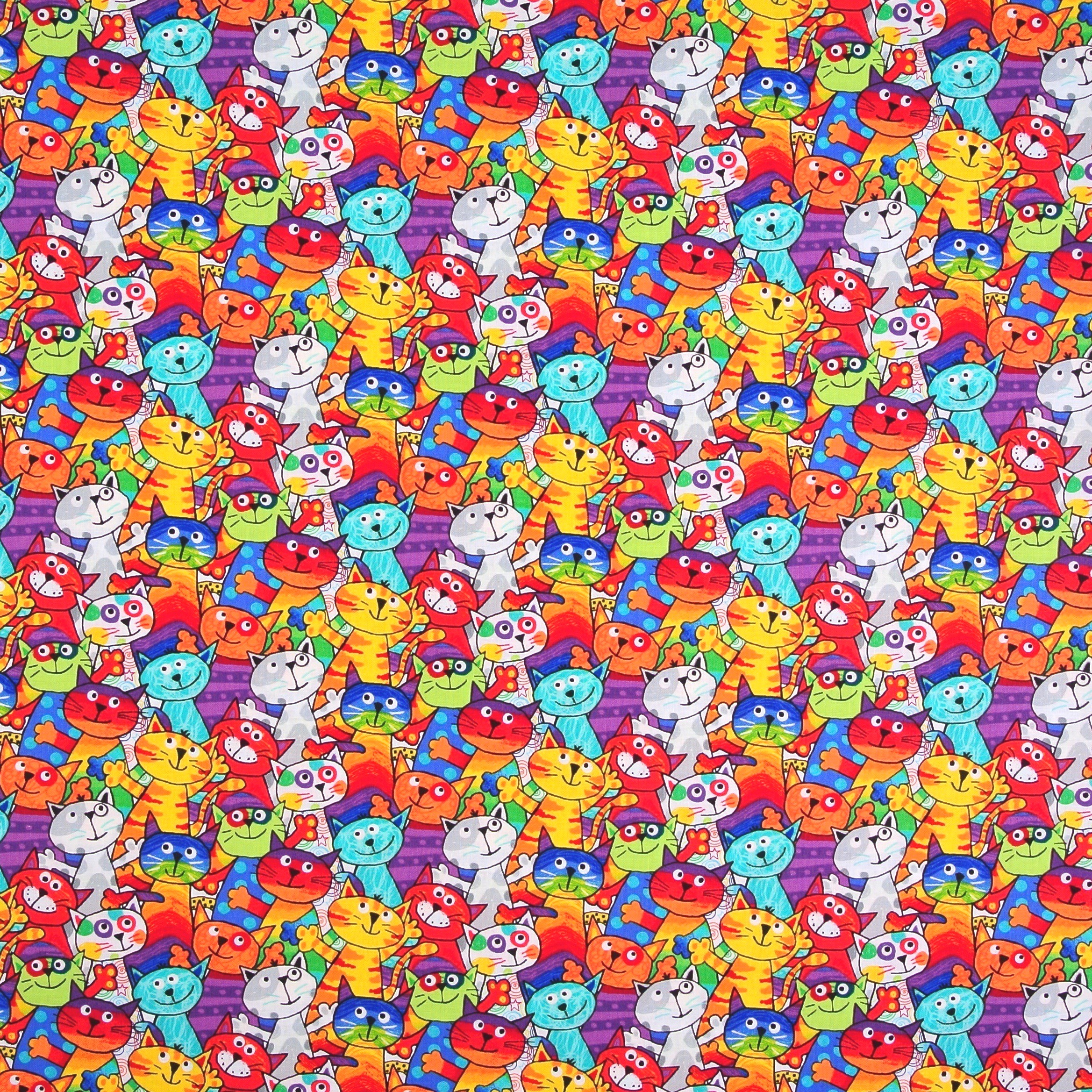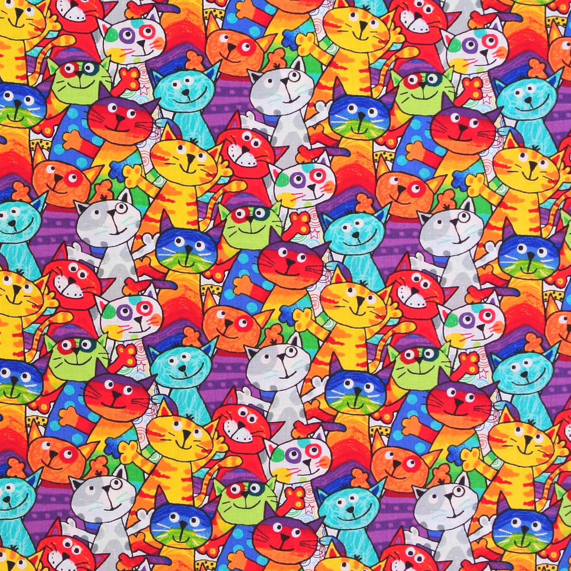 Patchworkstoff mit herrlich bunten, fröhlich feiernden Katzen aus der Serie "Cats and Dogs".
