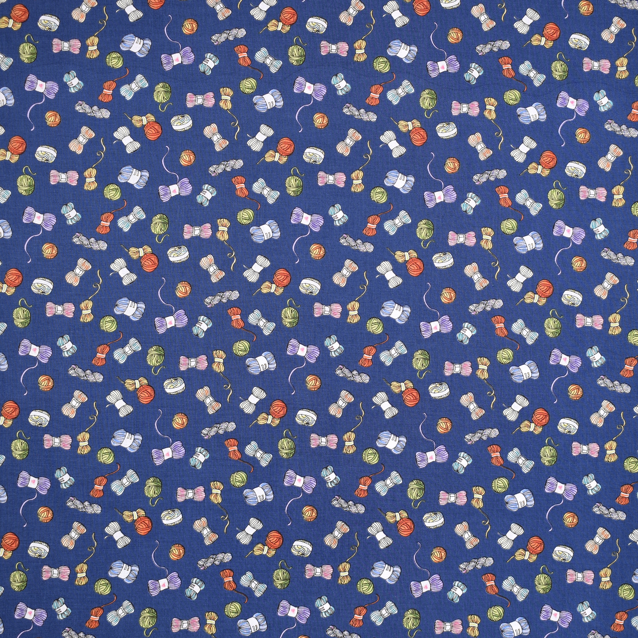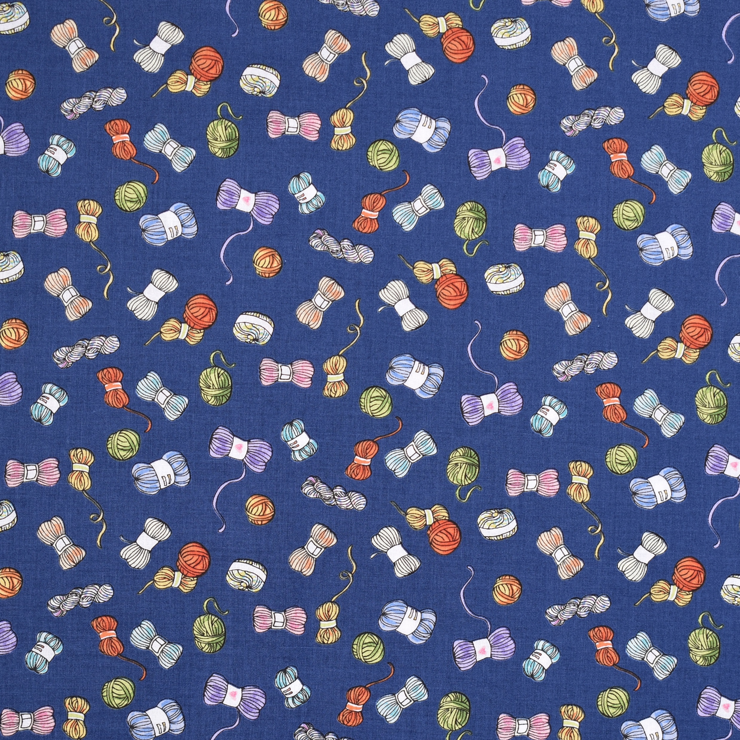 Patchworkstoff mit kleinen Wollknäuel auf Blau. Ein ausgefallener Webware-Baumwollstoff für Katzenliebhaberinnen und Strickbegeisterte - perfekt für Katzenaccessoires, Taschen, Kissen, Projekttaschen, Strickbeutel, Patchwork und Dekorationen.
