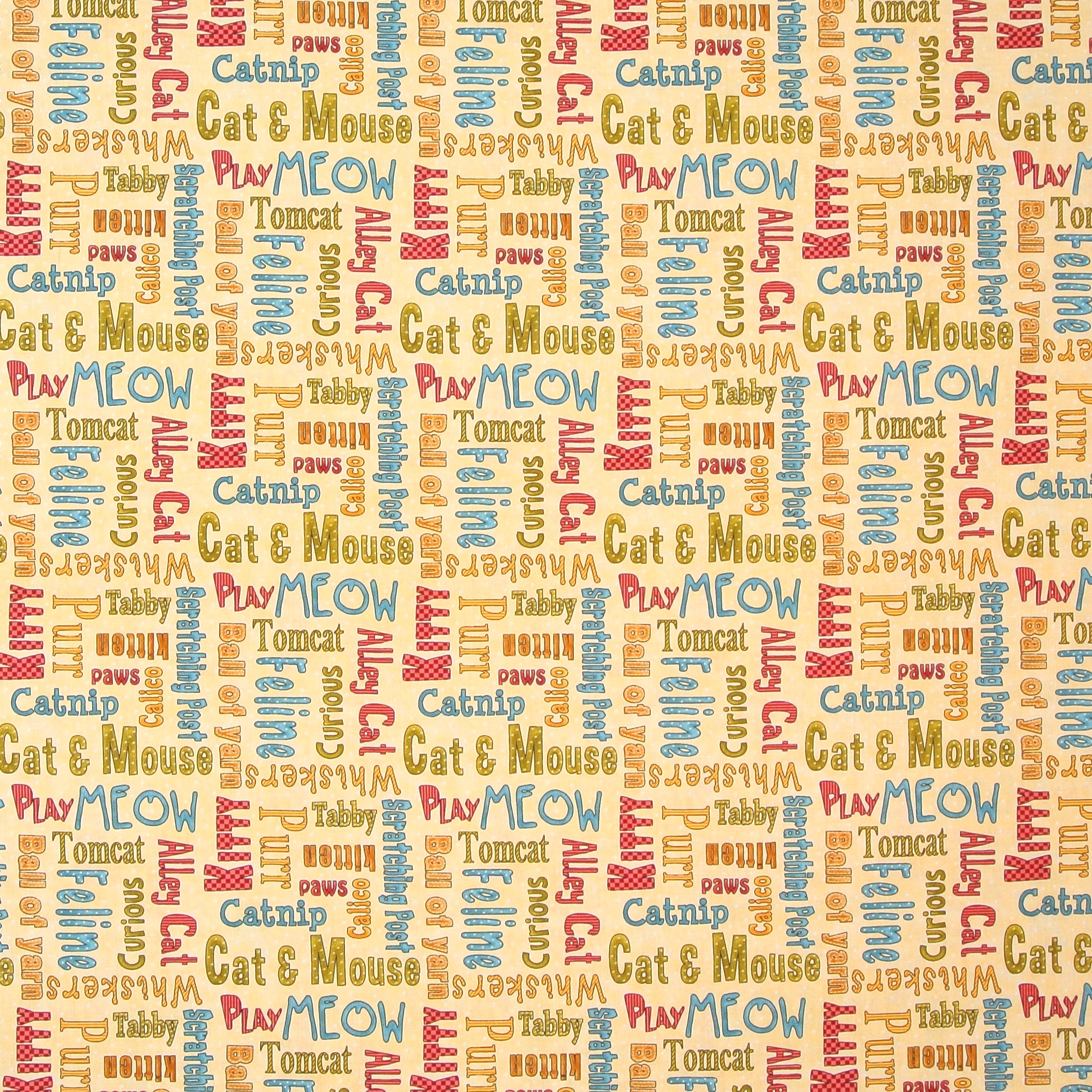 Patchworkstoff mit Schrift auf Hellbeige. Ein schöner Patchworkstoff zum Kombinieren mit den anderen Stoffen aus der Serie "Kitty Kat Kapers" von Henry Glass.