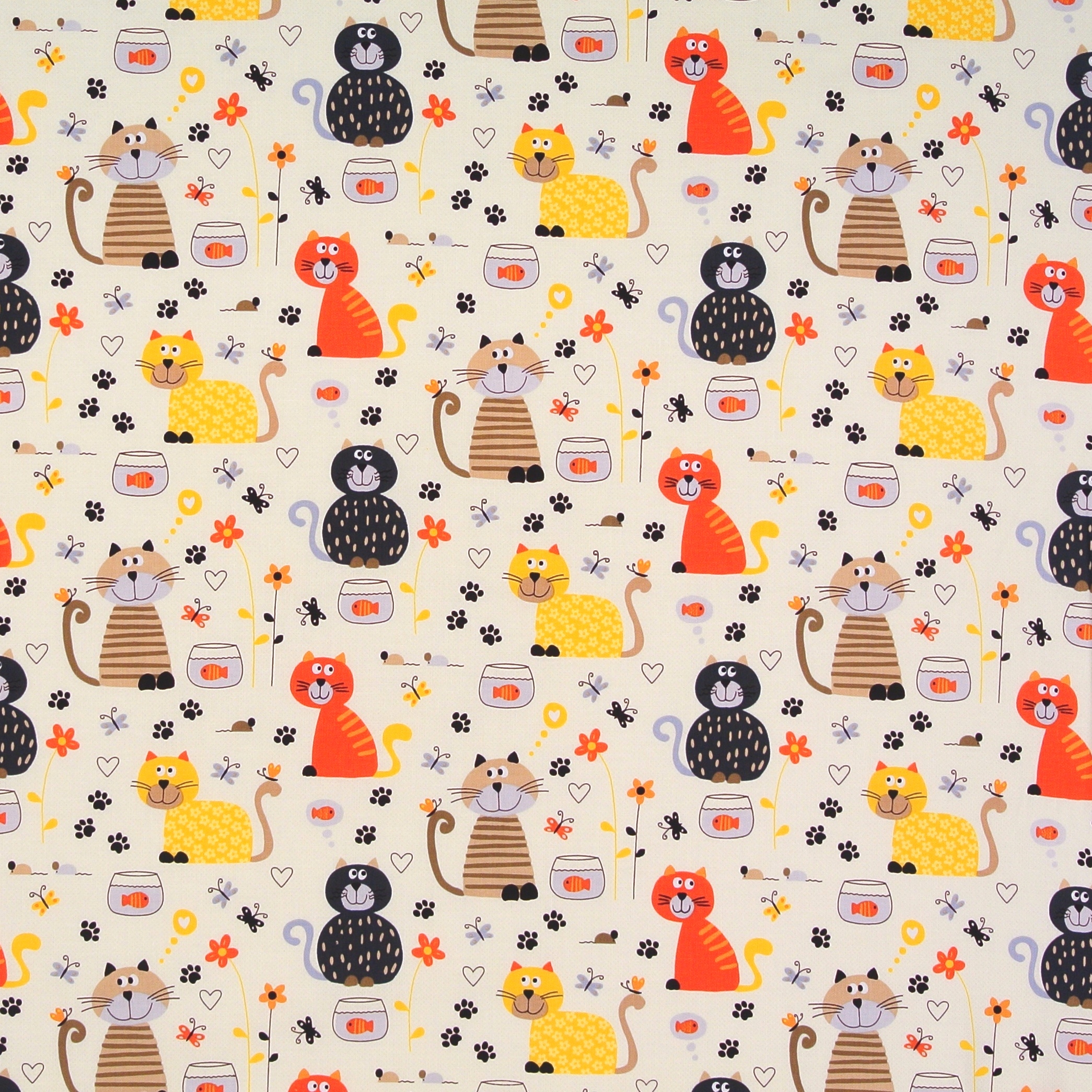 Patchworkstoff mit freundlichen Katzen, Fischen und Blumen aus der Serie "Cat and Fishes".
