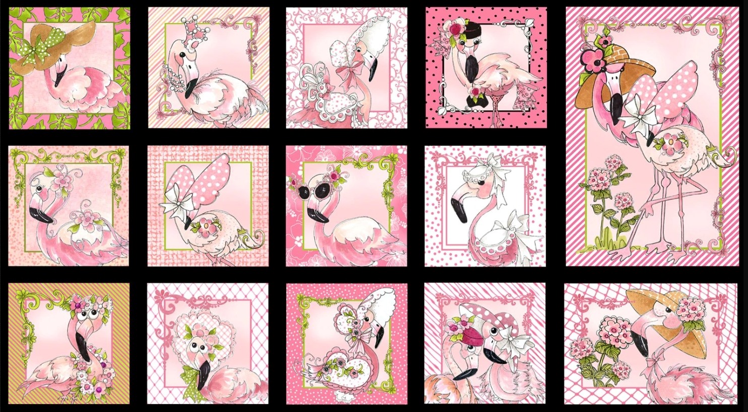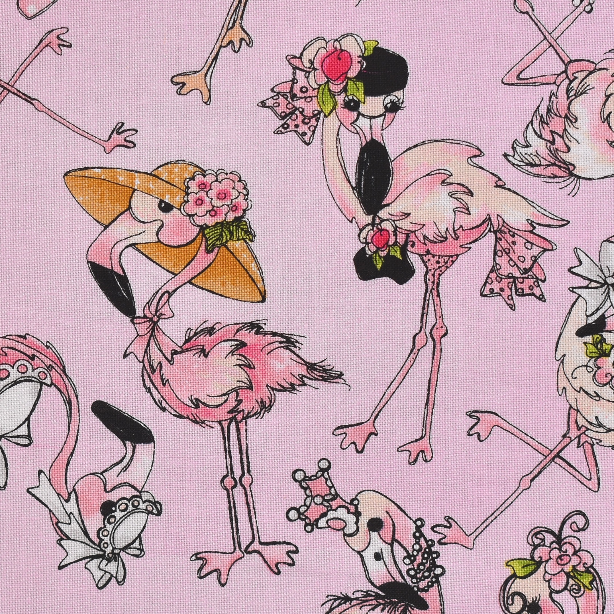 Rosa Flamingos: Patchwork mit witzig gekleideten Flamingos aus der Loralie Serie "Flams". Ein ausgefallener Patchworkstoff rund um diese eleganten Tiere.