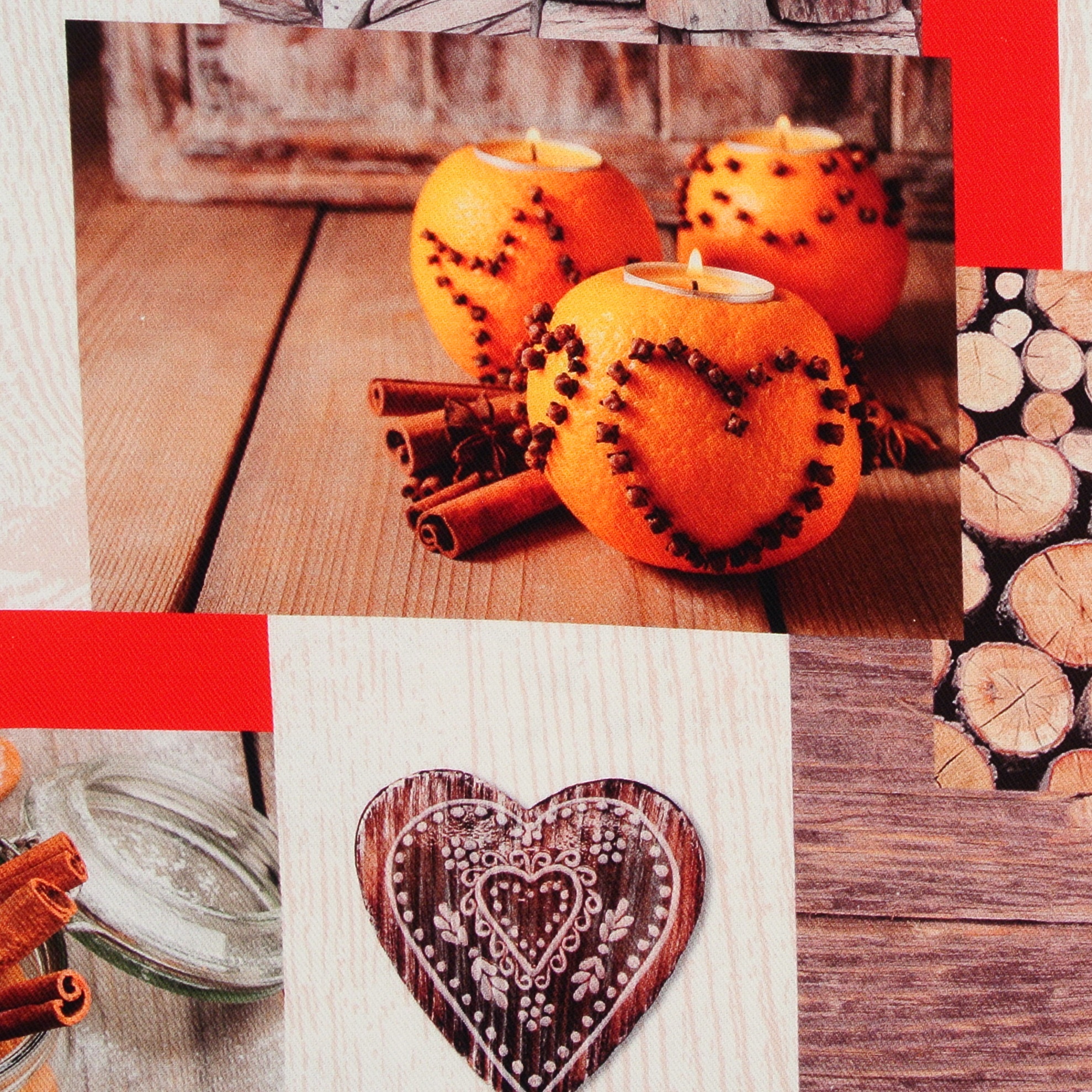 Weihnachtlicher Dekostoff mit leckerem Gebäck,verzierten Orangen und Holzstapeln. Ein etwas festerer Stoff für Taschen, Beutel, Tischdecken und weihnachtliche Dekorationen.